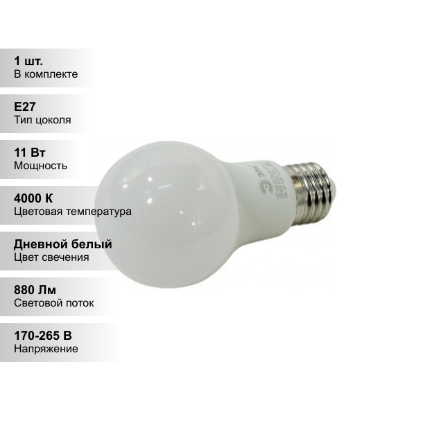 Б0029821_led A60-11W-840-E27 Эра (Диод, Груша, 11Вт, Нейтр, E27) (10/100/2000), Шт ЭРА арт. B0029821