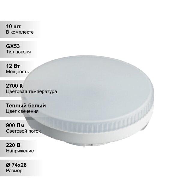 (5 шт.) Светодиодная лампочка онлайт GX53 св/д 12W(900lm) 2700K 2K 28x74 матовая OLL-GX53-12-230-2.7K 61190