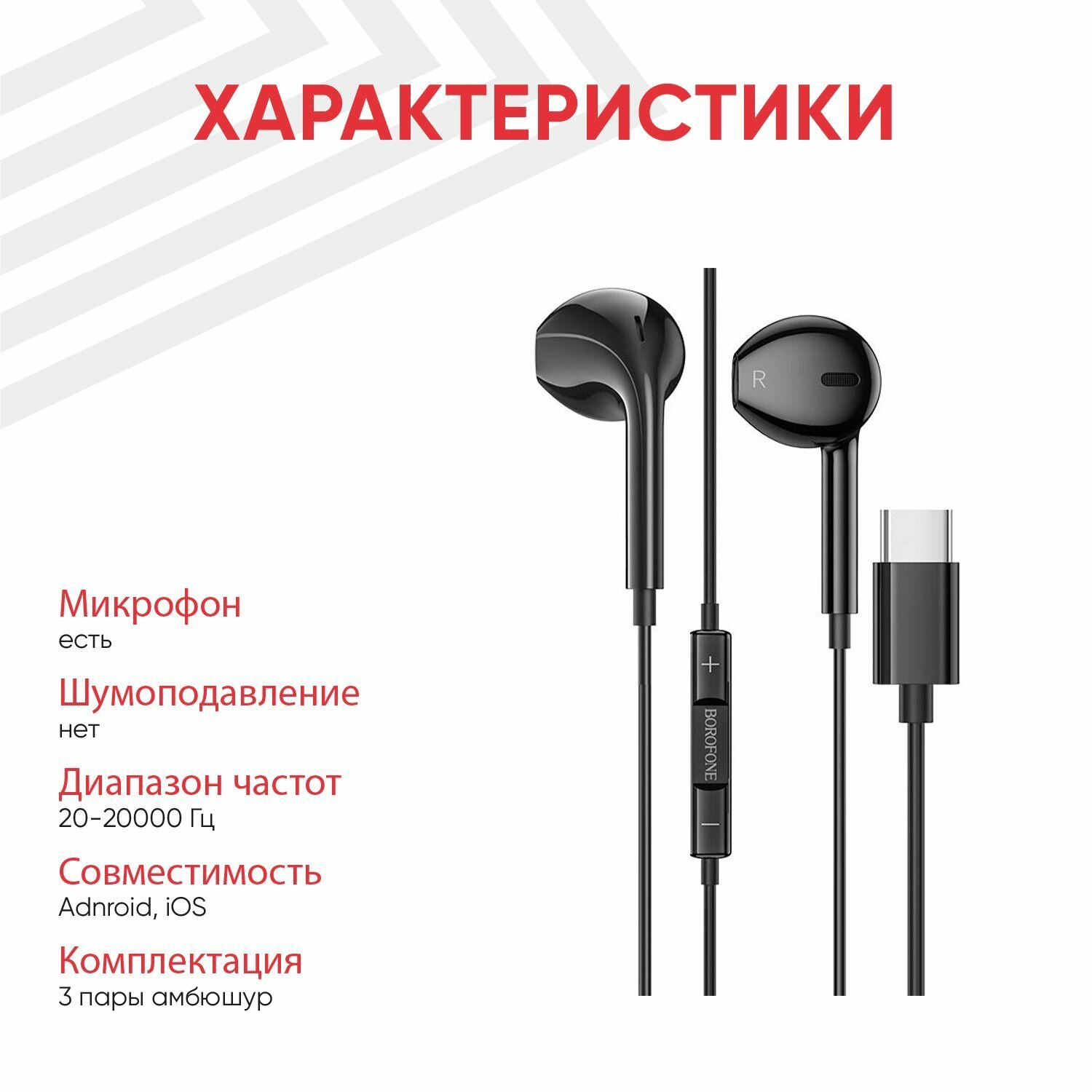 Наушники проводные с микрофоном Borofone BM56, USB Type-С, 1.2 метра, 20 шт. в упаковке, черные интересное: