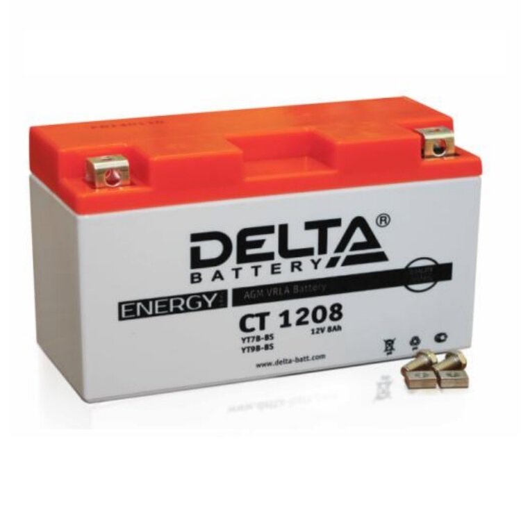 Мото аккумулятор стартерный Delta CT 1208 12В 8 Ач прямая полярность 110А (12V 8Ah)(YT7B-BS; YT7B-4; YT9B-BS) аккумулятор для мотоцикла, мопеда, скутера, квадроцикла, снегохода, дизельных генераторов