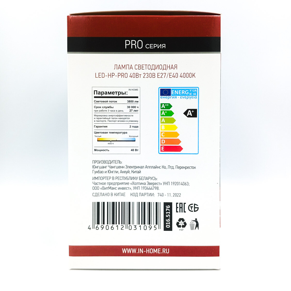 (18 шт.) Светодиодная лампочка IN HOME LED-HP-PRO, мощность 40 Вт, напряжение питания 220 В, цветовая температура 4000К, нейтральный белый свет, 3600 Лм, цоколь Е27 с адаптером E40, размер 115х190 мм