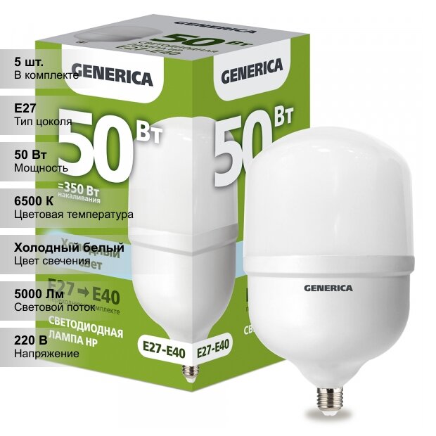 Лампа светодиодная Generica HP-50, E40/E27, HP, 50 Вт, 6500 К