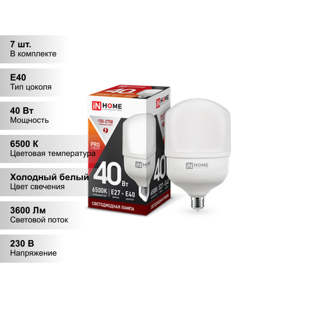 Лампа светодиодная IN HOME LED-HP-PRO, 40 Вт, 230 В, Е27, E40, 6500 К, 3800 Лм, с адаптером