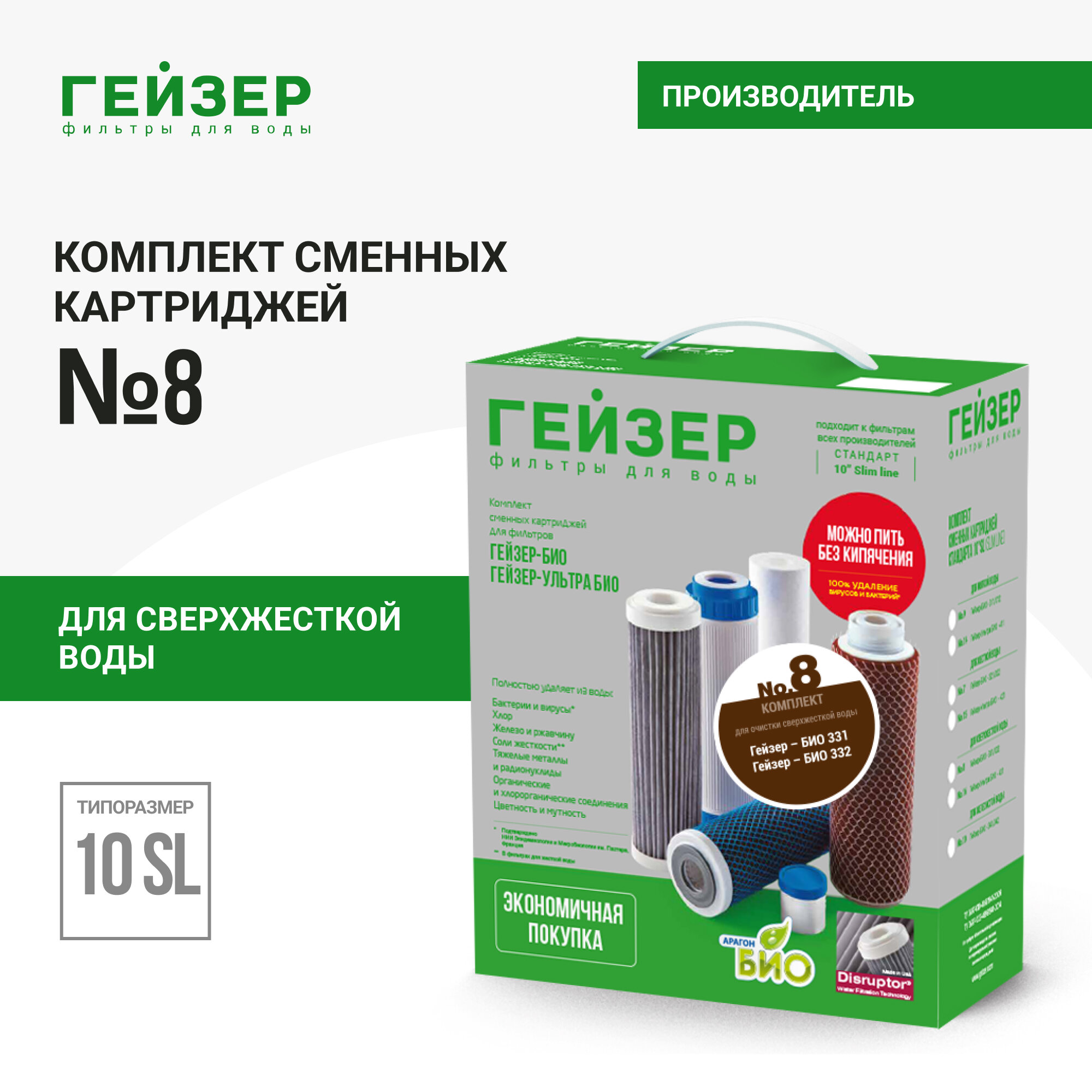 Комплект картриджей Гейзер № 8, 100% удаление бактерий и вирусов, предназначен для фильтров Гейзер БИО 331 и Гейзер БИО 332 (воды с высоким содержанием солей), 50036