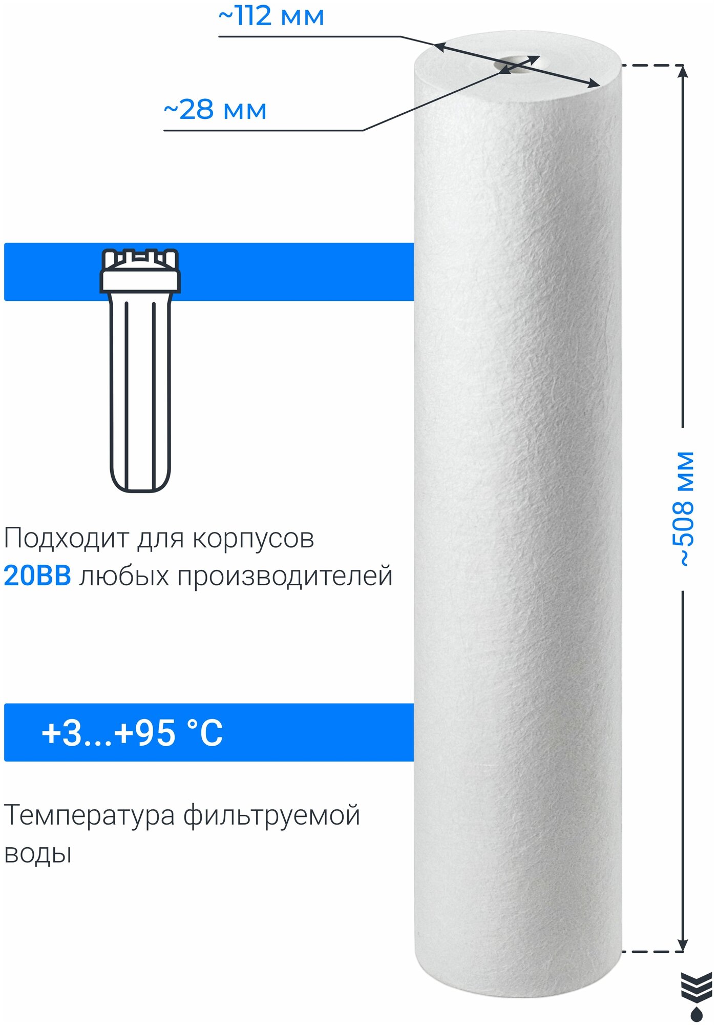 Картридж из полипропилена Адмирал ФПП-20Б-5 мкм (PP-20BB, ЭФГ 112/508), фильтр грубой очистки холодной и горячей воды для Гейзер, Барьер, Аквафор