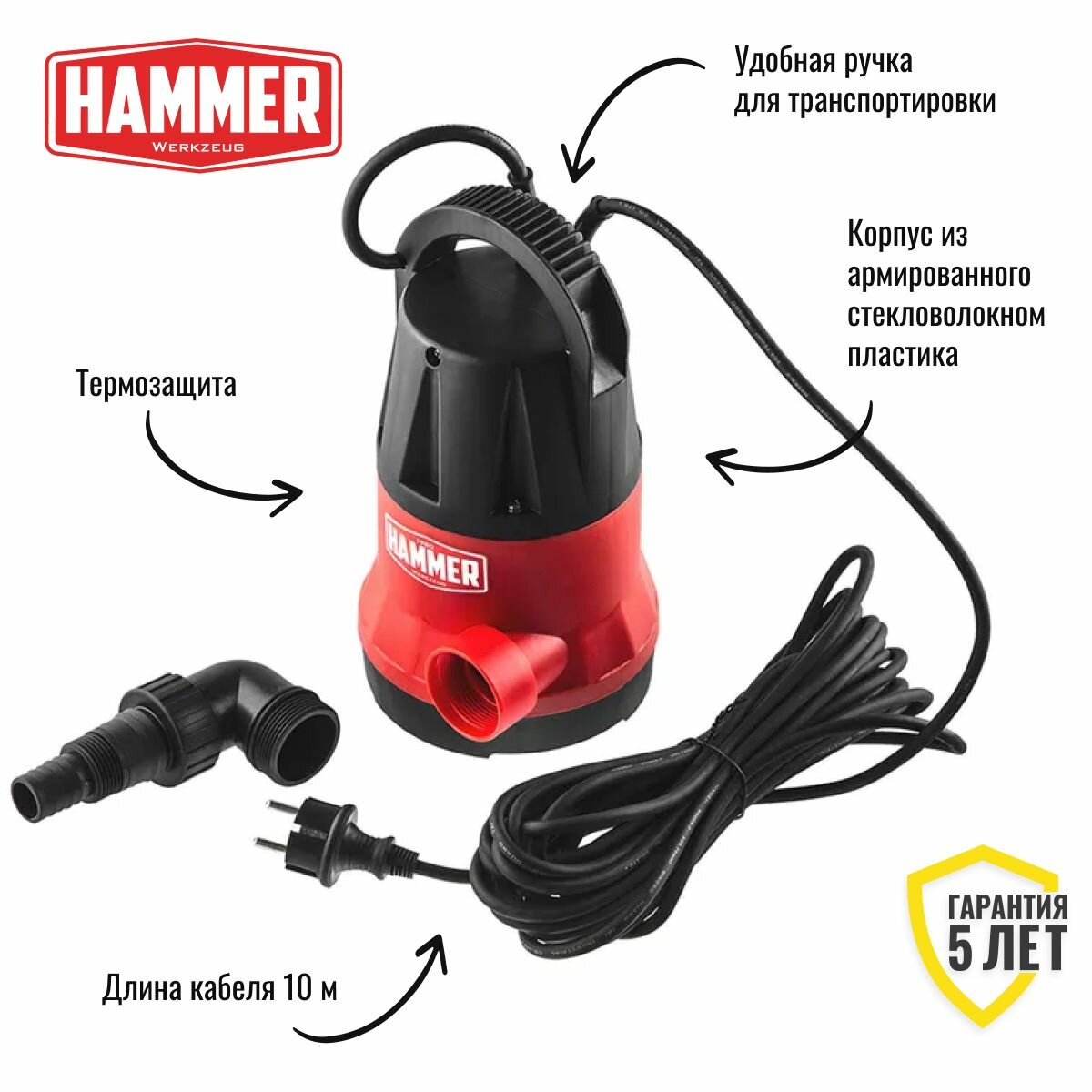 Насос дренажный Hammer NAP250CD 250Вт, 6000л/ч, высота 6м, глубина 7м