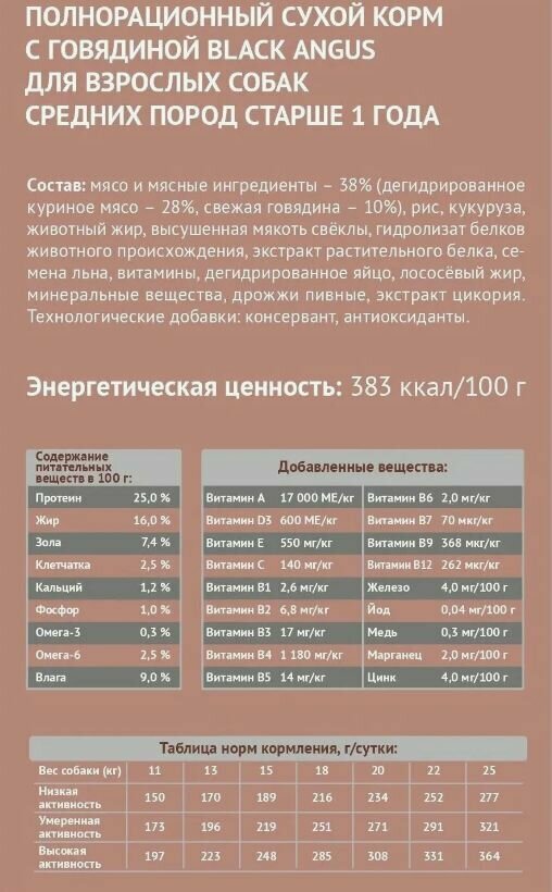| Состав | мясо и мясные ингредиенты – 38,5% (дегидрированное куриное мясо – 28,5%, свежая говядина - 10%), рис, кукуруза, животный жир, высушенная мякоть свёклы, экстракт растительного белка, гидролизат белков животного происхождения, семена льна, лососёвый жир, витамины, минеральные вещества, дрожжи пивные, экстракт цикория, глюкозамин, хондроитин |