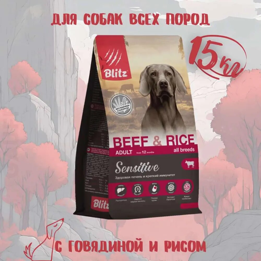 Сухой корм для собак Blitz при чувствительном пищеварении, говядина, с рисом 15 кг