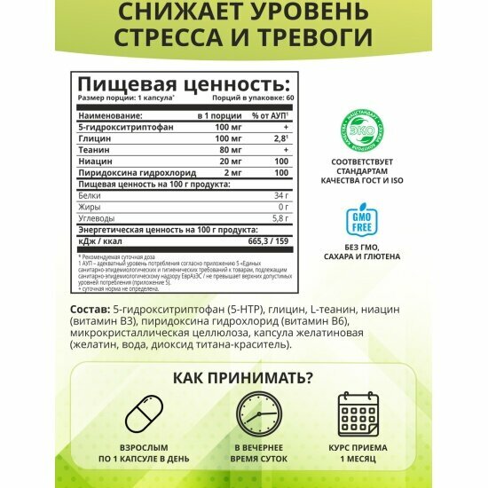5 HTP 100 мг (5НТР, 5-ХТП, 5-гидрокситриптофан), витамины с теанином и глицином