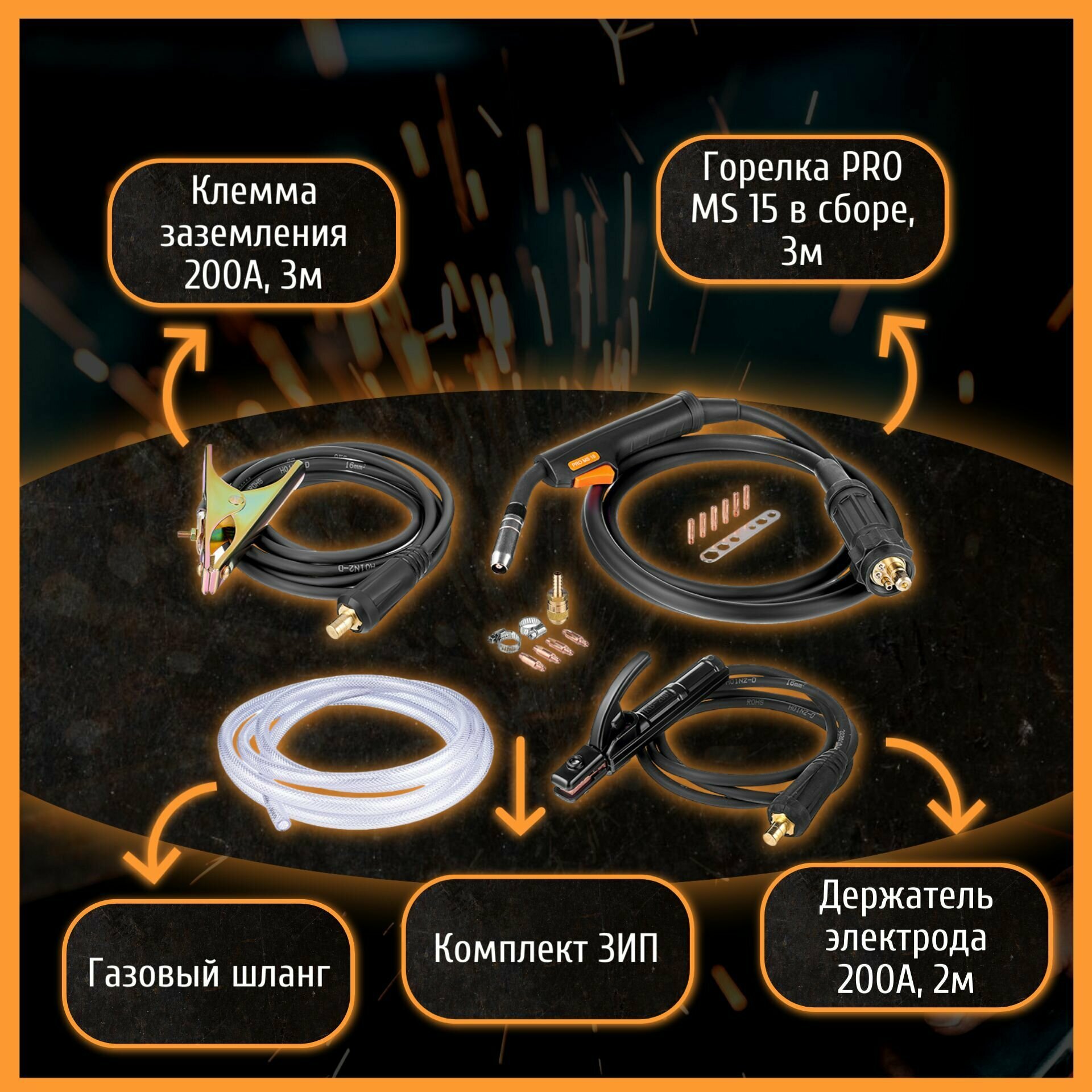 | Комплектация | инверторный сварочный аппарат — 1 шт, горелка pro ms 15, 3 м — 1 шт, электрододержатель в сборе 200 а, 2 м —1 шт, клемма заземления в сборе 200 а, 3 м — 1 шт, комплект зип — 1 шт, паспорт и руководство по эксплуатации — 1 шт |