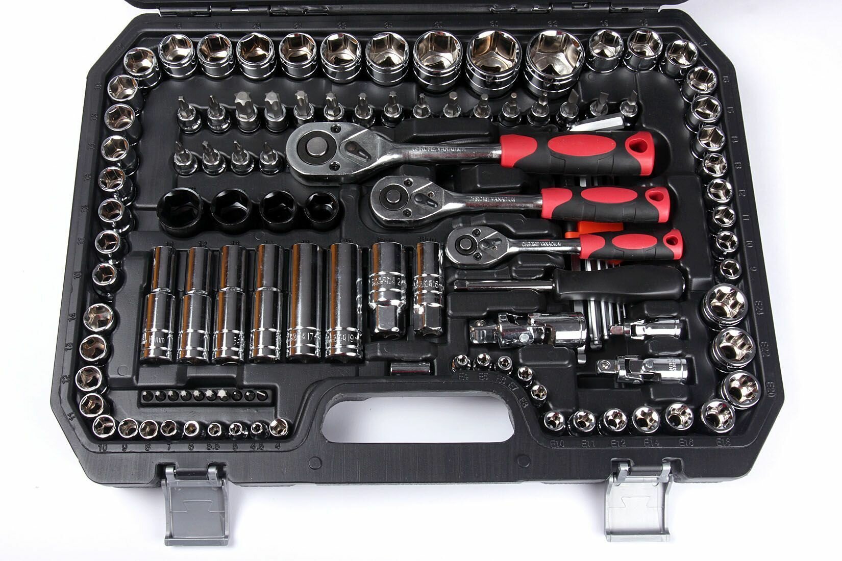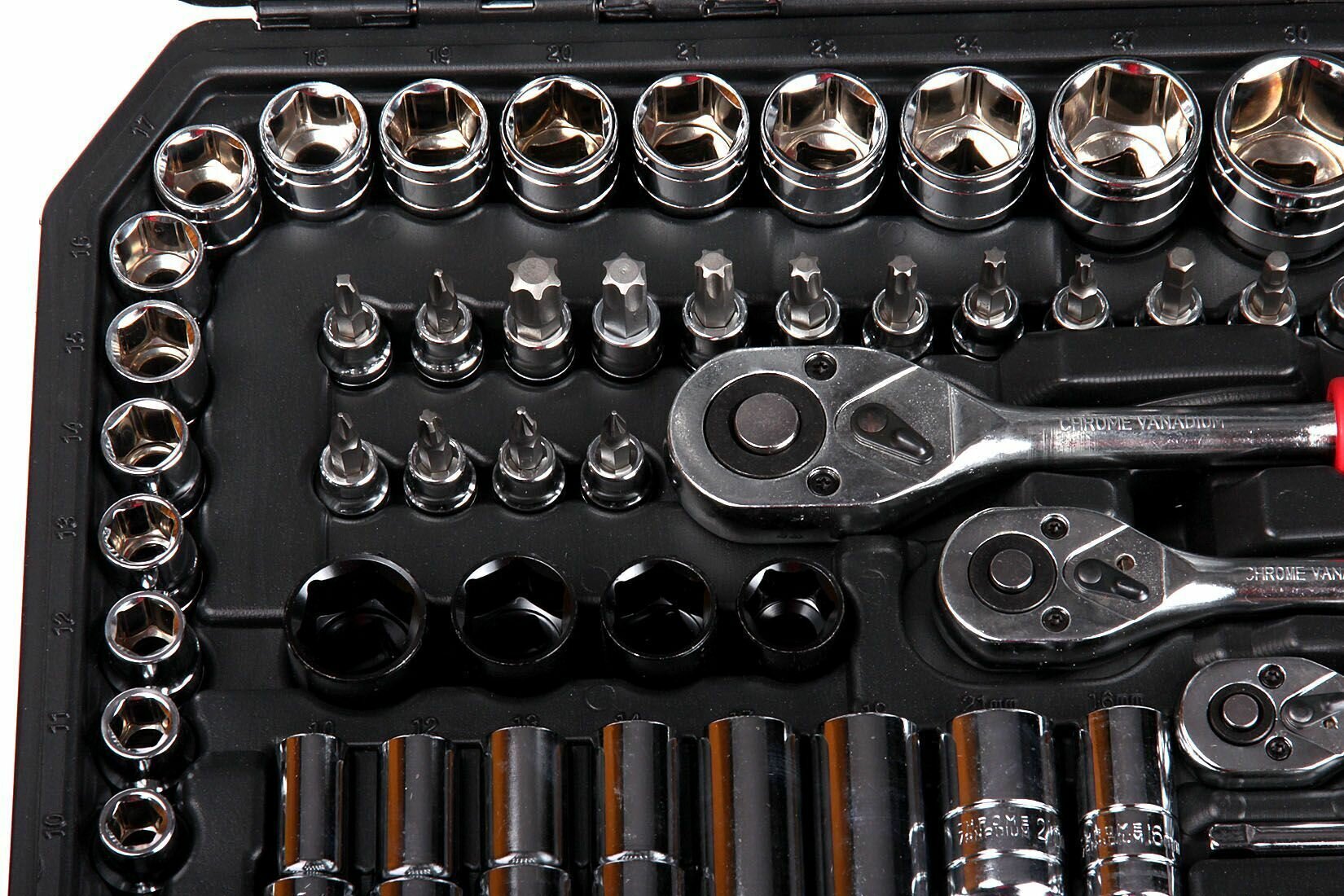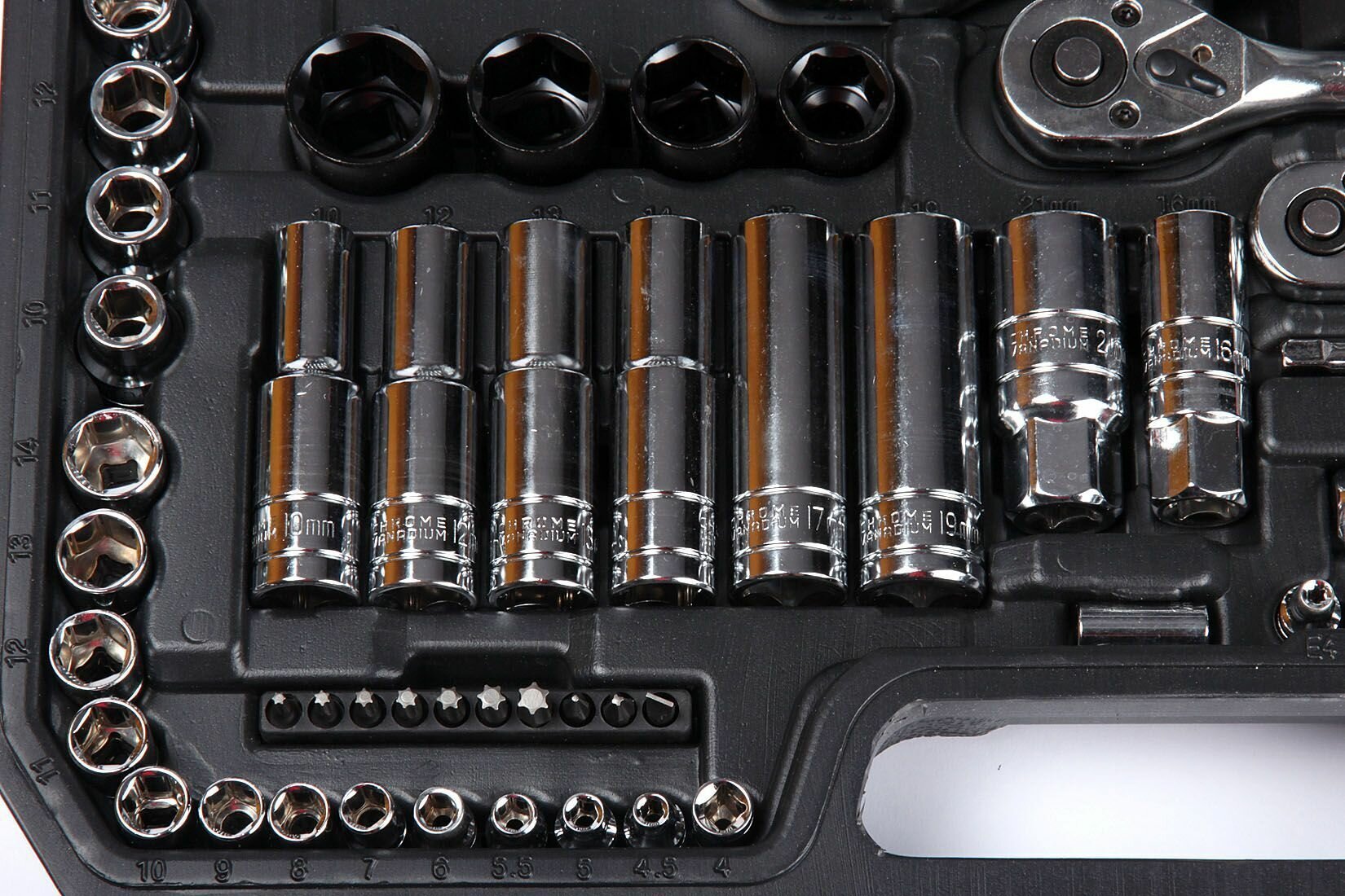 | Головки торцевые подробно | метрические удлинённые шестигранные торцевые головки, посадочный размер 1/4: 4, 5, 6, 7, 8, 9; метрические удлинённые шестигранные торцевые головки, посадочный размер 3/8: 10, 11, 12, 13, 14, 15; метрические удлинённые шестигранные торцевые головки, посадочный размер 1/2: 10, 12, 13, 14, 17, 19; метрические шестигранные торцевые головки, посадочный размер 1/2: 10, 11, 12, 13, 14, 15, 16, 17, 18, 19, 20, 21, 22, 24, 27, 30, 32; метрические шестигранные торцевые головки, посадочный размер 3/8: 9, 10, 11, 12, 13, 14, 15, 16, 17, 18, 19; -метрические шестигранные торцевые головки, посадочный размер 1/4: 4, 4.5, 5, 5.5, 6, 7, 8, 9, 10, 11, 12, 13, 14; торцевые головки е-стандарта (внутренний torx), посадочный размер 3/8: е4, е5, е6, е7, е8, е10, е11, е12, е14, е16, е18, е20, е22, е24; ударопрочные метрические шестигранные торцевые головки, посадочный размер 1/2: 17, 19, 21, 23; свечная головка, посадочный размер 1/2: 16, 21 |