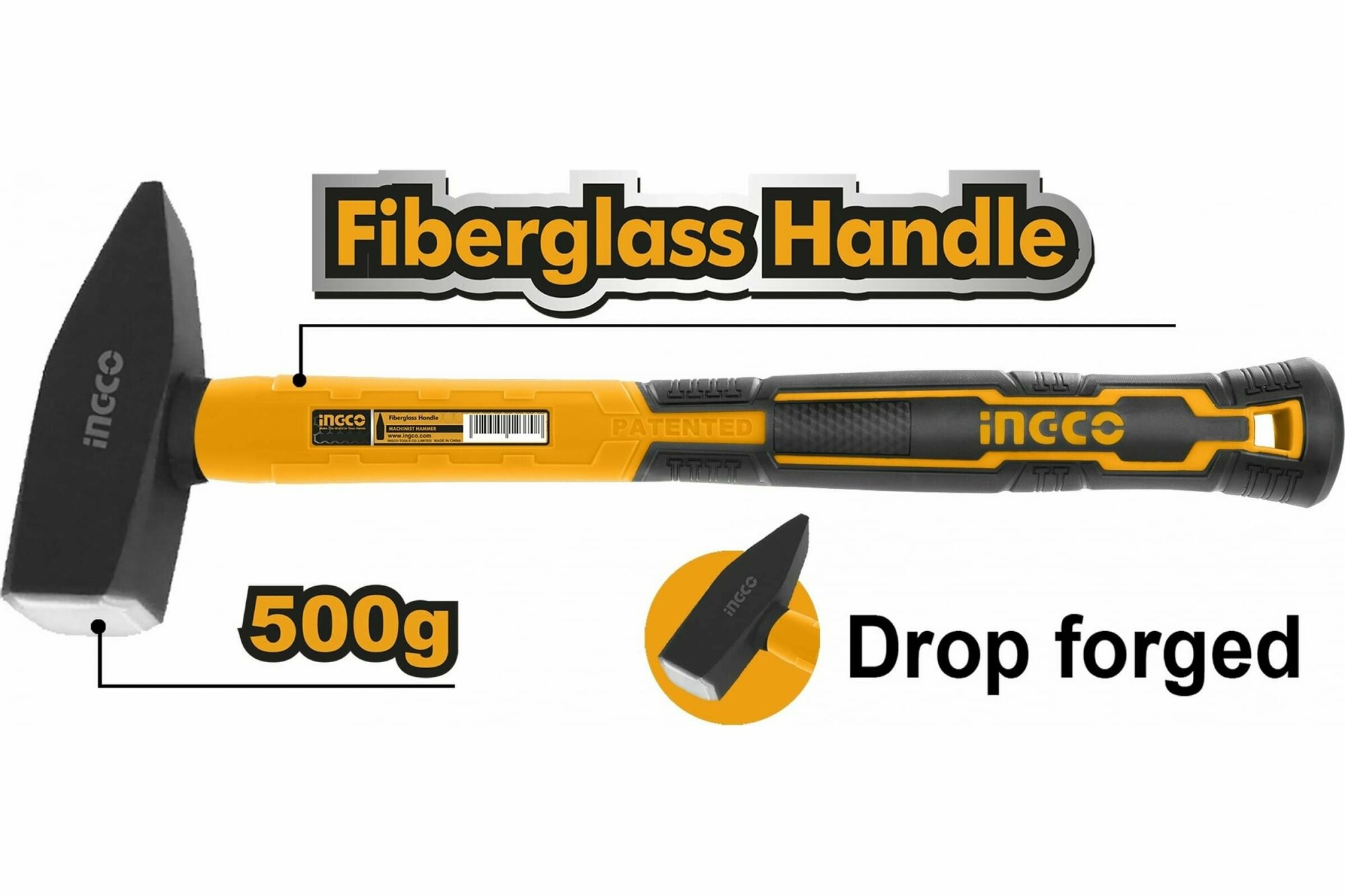 Молоток слесарный, 45 углеродистая сталь, фиберглассовая рукоятка, 500гр, INGCO HMH880500