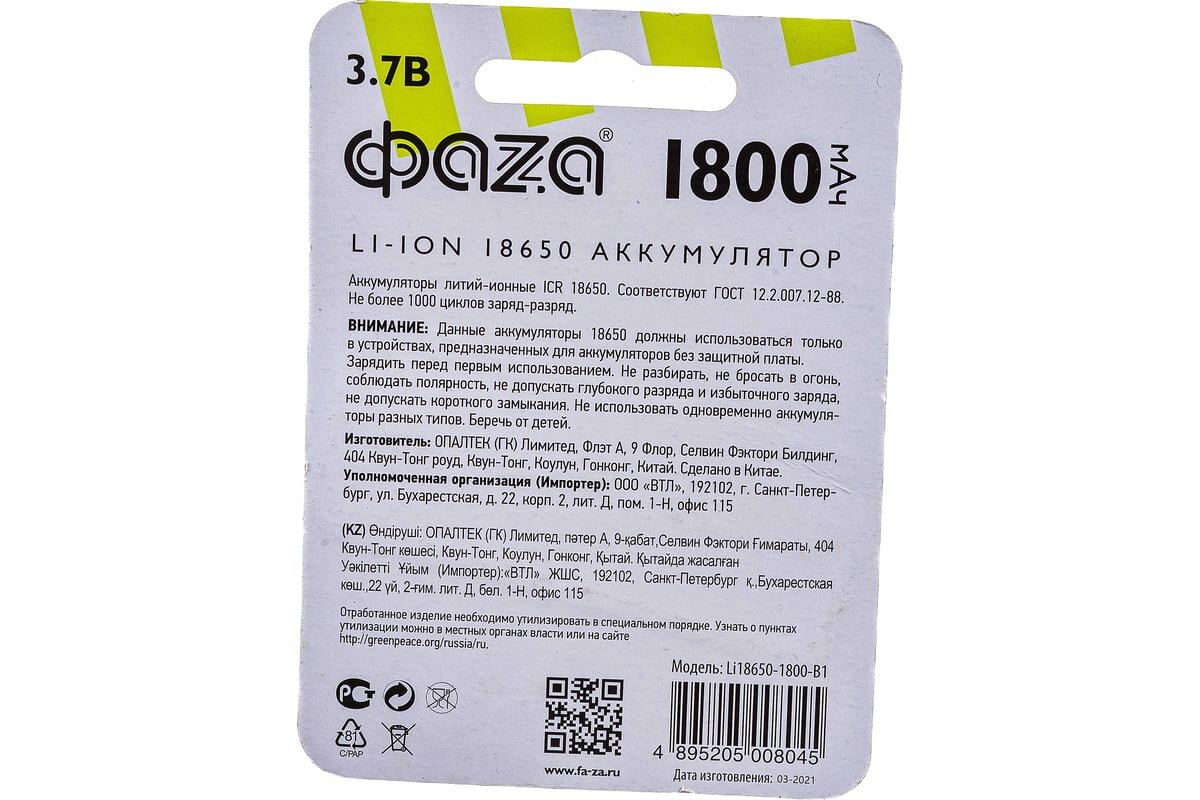 Аккумулятор Li-Ion 18650 1800мАч BL-1 ФАZА