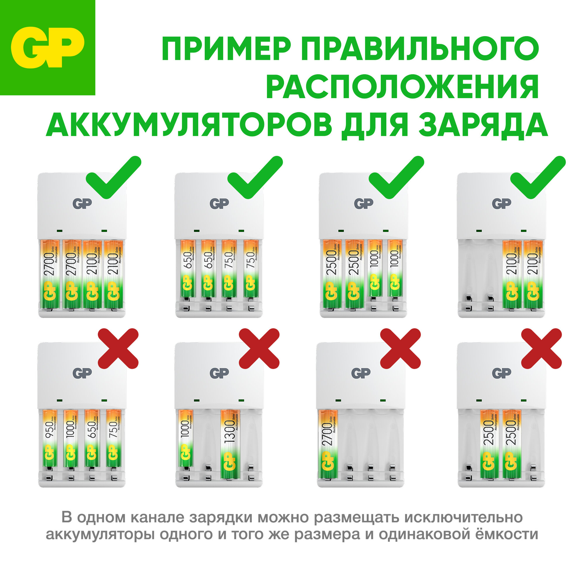 Купить Зарядное устройство GP для аккумуляторных батареек АА и ААА на 4 слота, с аккумуляторами ААА 1000 mAh NiMH, набор 4 шт