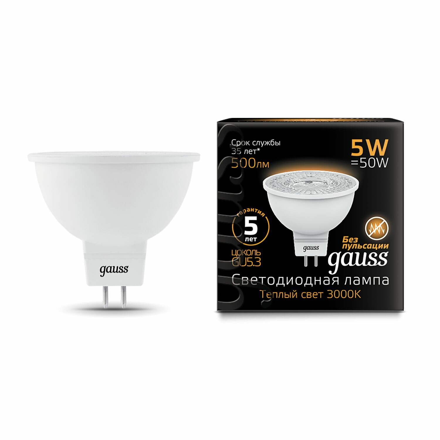 Лампа Gauss MR16 5W 500lm 3000K GU5.3 LED 101505105 (10 шт)