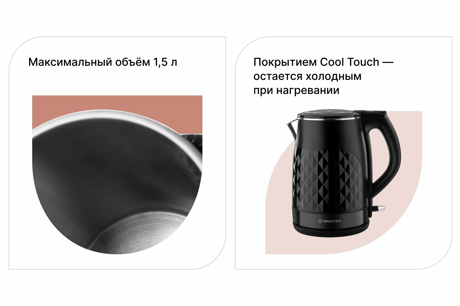 BRAYER 1043BR-BK Чайник электрический ,2200 Вт, 1,5 л, нерж +покрытие Cool Touch, черн