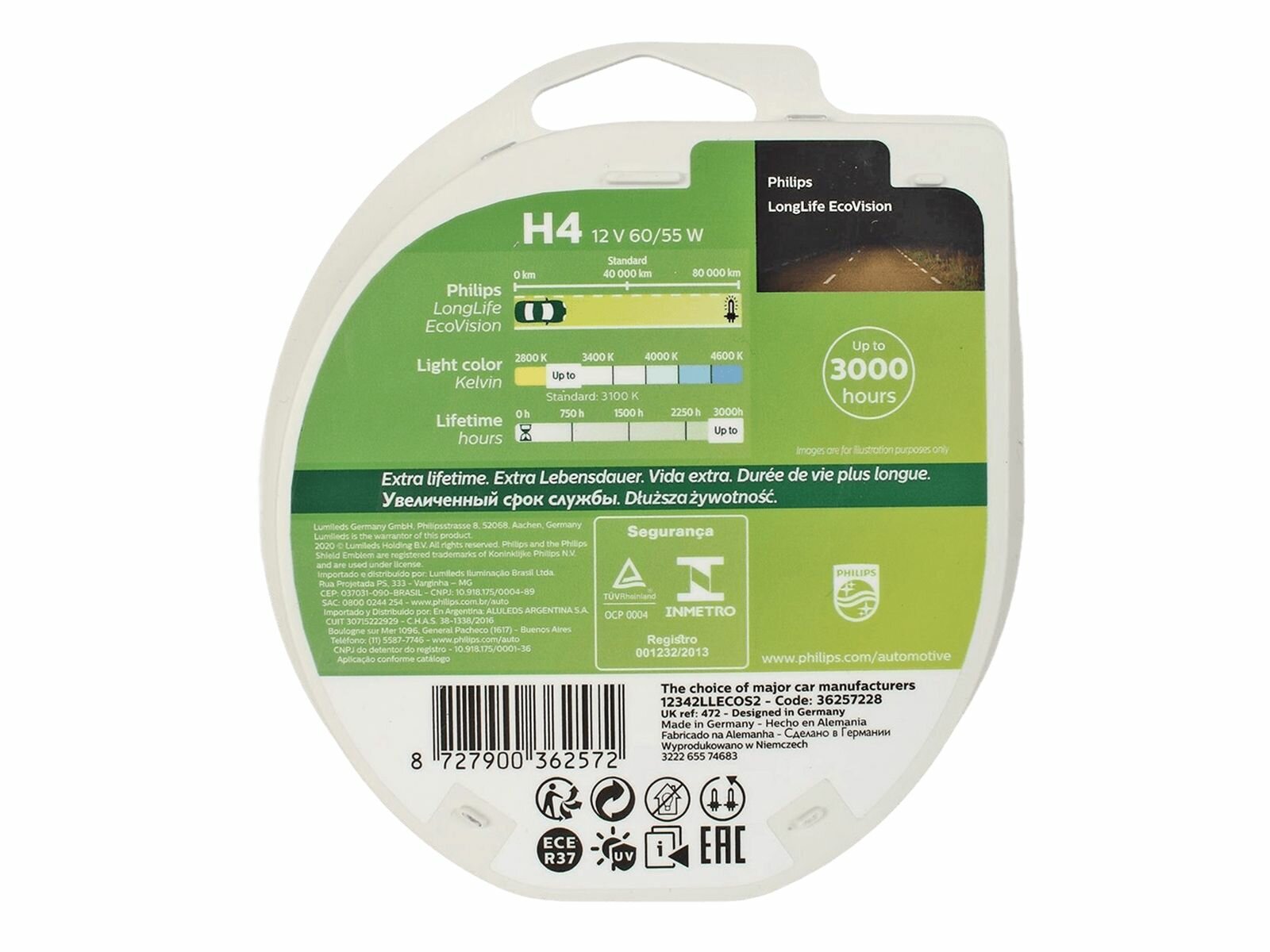 Лампа H4 (60/55w) P43t-38 Long Life Ecovision 12v (2шт) 12342lleco S2 36257228 Philips арт. 12342LLECOS2