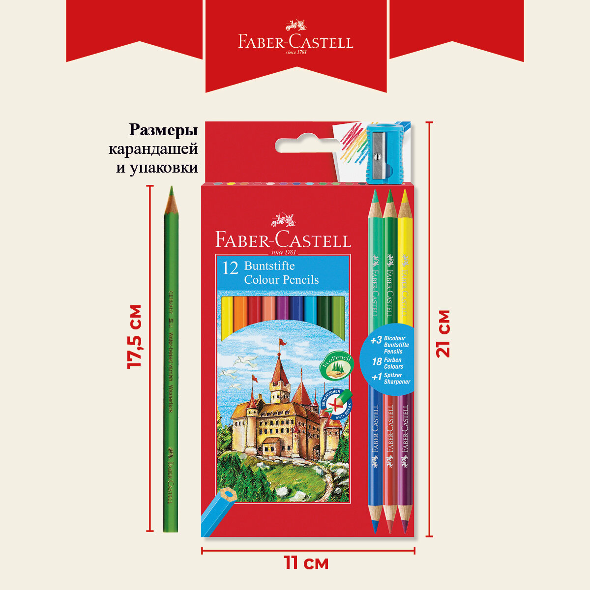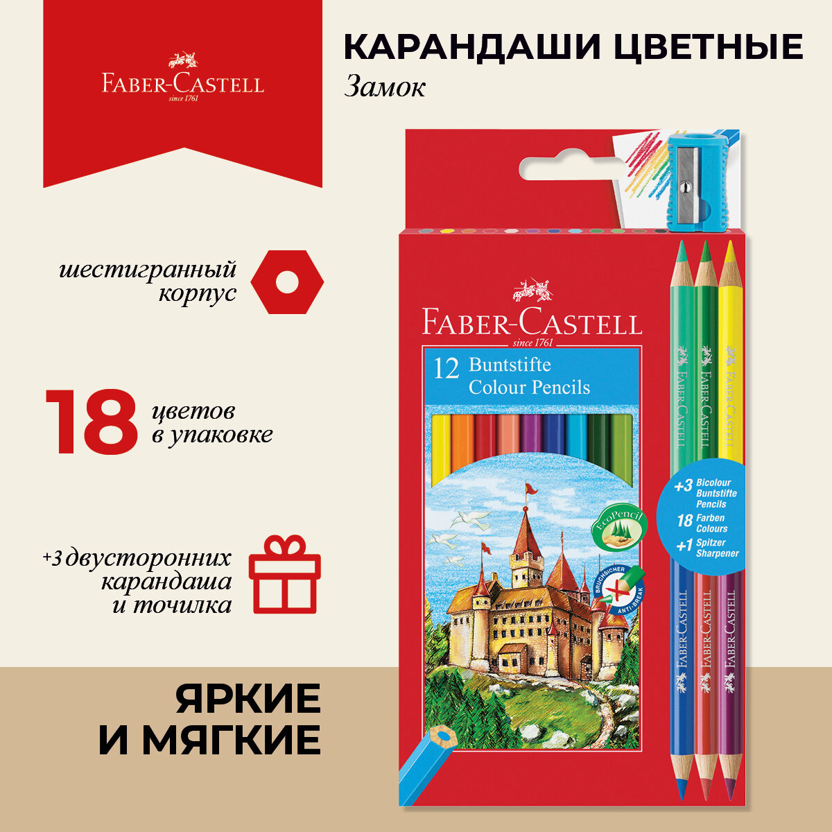 Карандаши цветные Faber-Castell Замок 12 цветов шестигранные и 6 цветов круглые с точилкой, 1412738