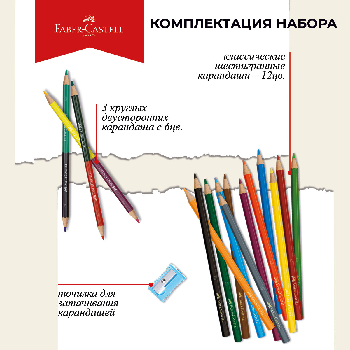 | Дополнительная информация | 12 шестигранных и 3 двухцветных круглых карандаша с точилкой |
