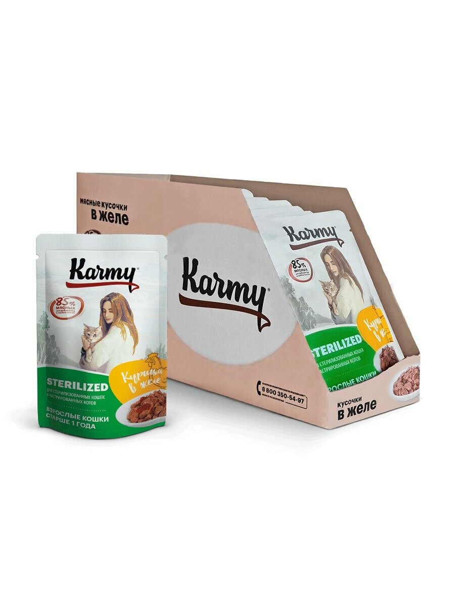 Купить Karmy Sterilized пауч для стерилизованных кошек и кастрированных котов (кусочки в желе) Курица, 80 г. упаковка 12 шт