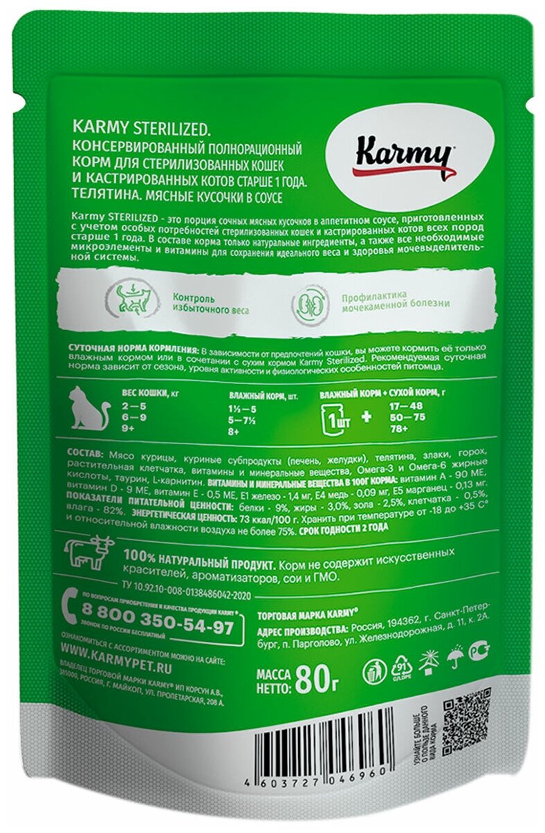 Корм Karmy Sterilized (в соусе) для стерилизованных кошек, с телятиной, 80 г x 24 шт