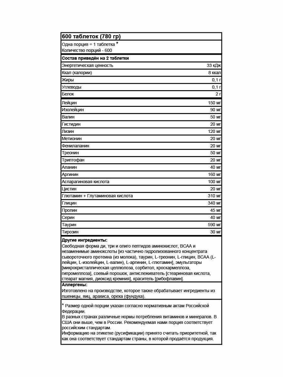 | Состав | cвободной формы ди-, три- и олигопептиды аминокислоты из гидролизованного изолята сывороточного протеина, L-лейцин, L-валин, L-изолейцин, L-аргинин, L-глицин, L-орнитин, микрокристаллическая целлюлоза, стеариновая кислота, диоксид кремния, масло и порошок соевых бобов, гидроксипропил метилцеллюлоза, тальк, среднецепочечные триглецириды, рибофлавин, диоксид титана, инулин |
