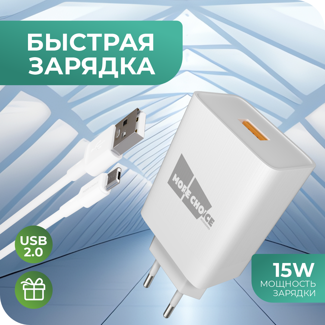 Купить Сетевое зарядное устройство 1USB 3.0A QC3.0 с кабелем micro USB быстрая зарядка More choice NC52QCm White
