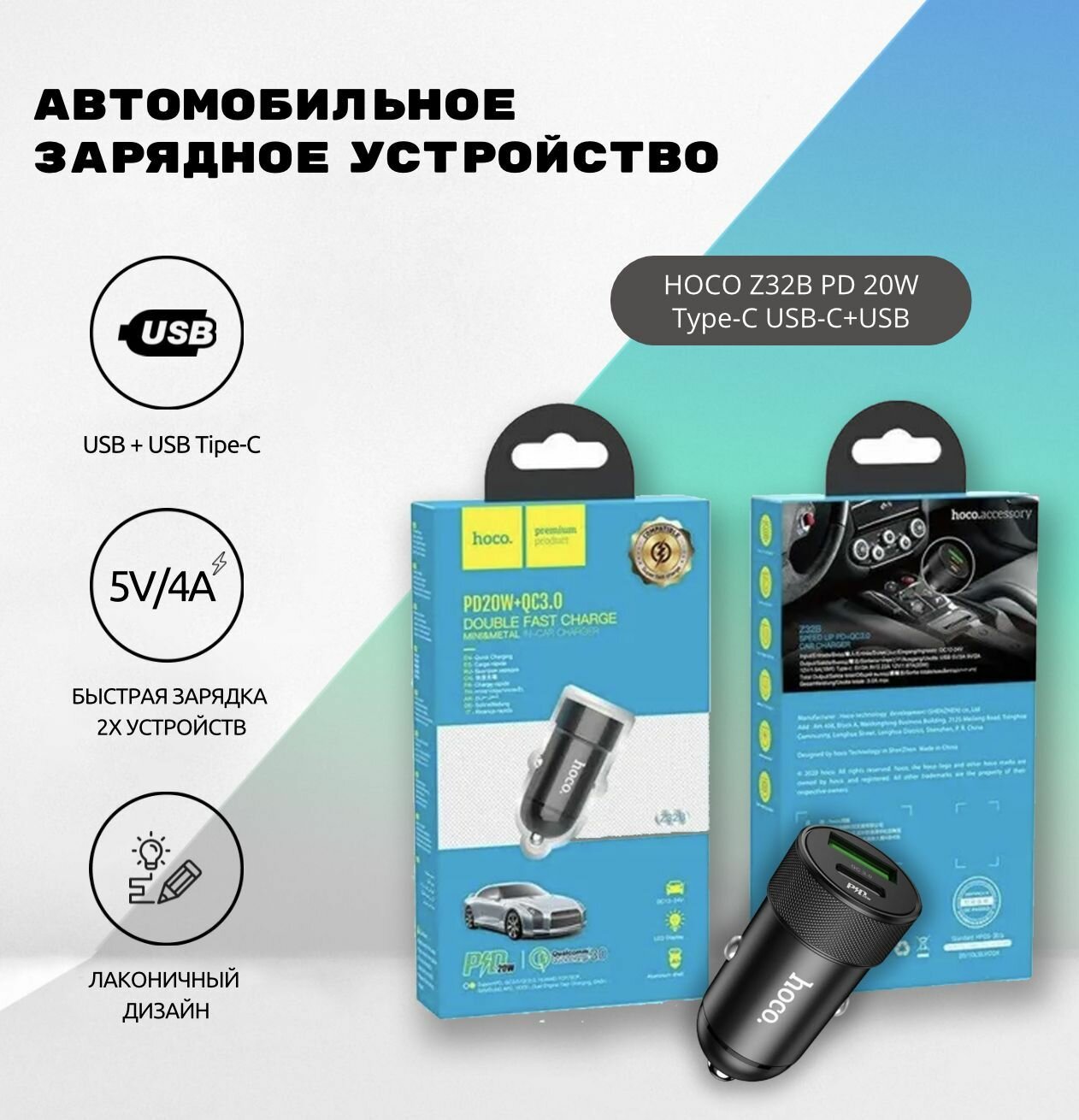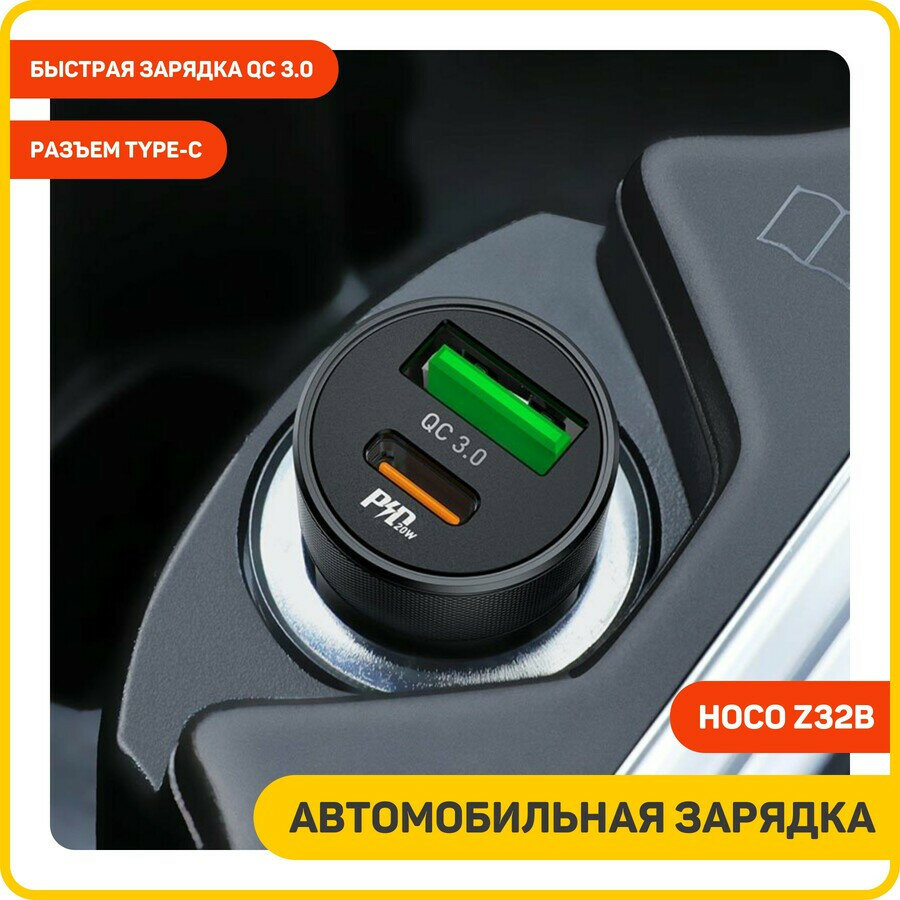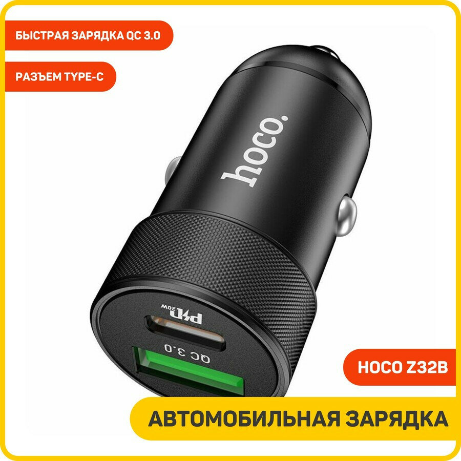 Купить Автомобильное зарядное устройство Hoco Z32B, 1 Type-C, 1 USB, 20 Вт, 4 А, PD + QC, чёрное