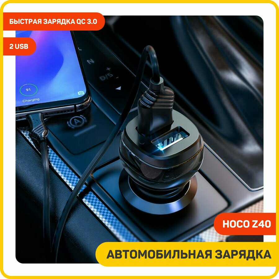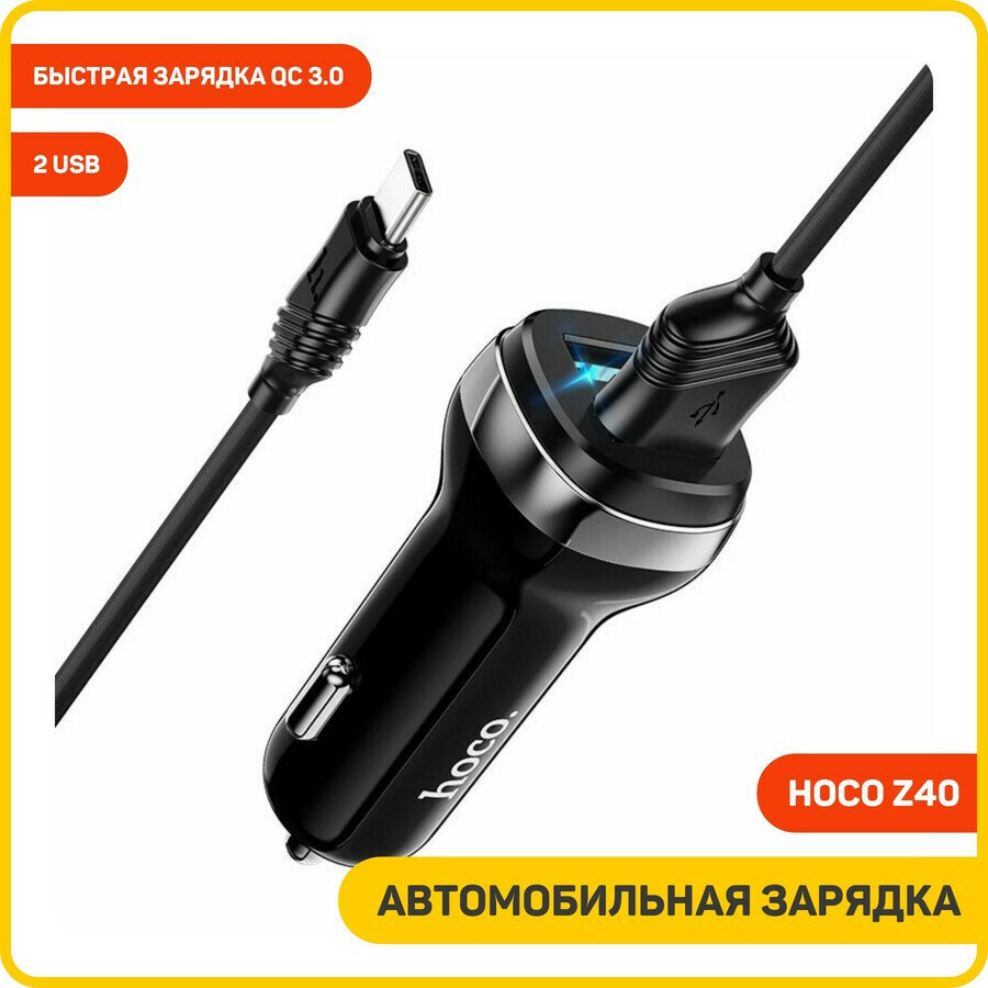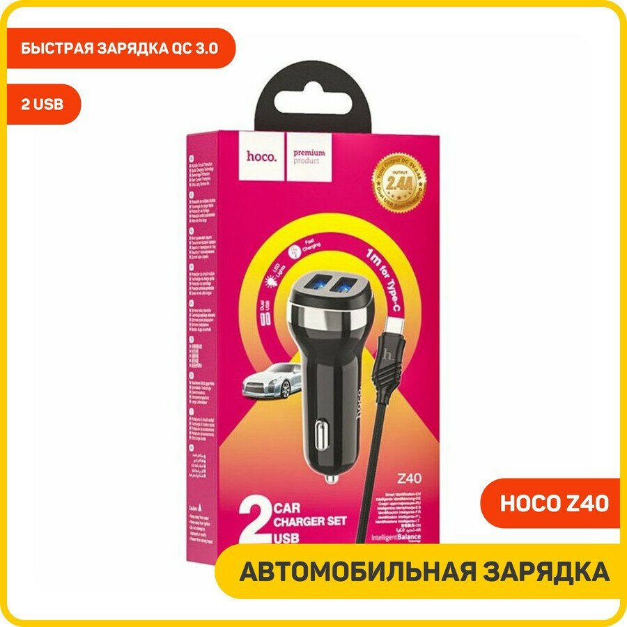 Автомобильное зарядное устройство (АЗУ) Hoco Z40 (2 USB) + кабель Type-C, 2.4 А, черный