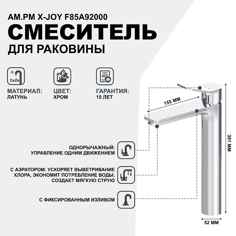 Купить Смеситель для накладной раковины в ванную AM.PM X-Joy F85A92000, кран для ванной, хром, высокий, монолитный излив 155 мм, керамический картридж Soft Motion, гарантия 10 лет, Германия