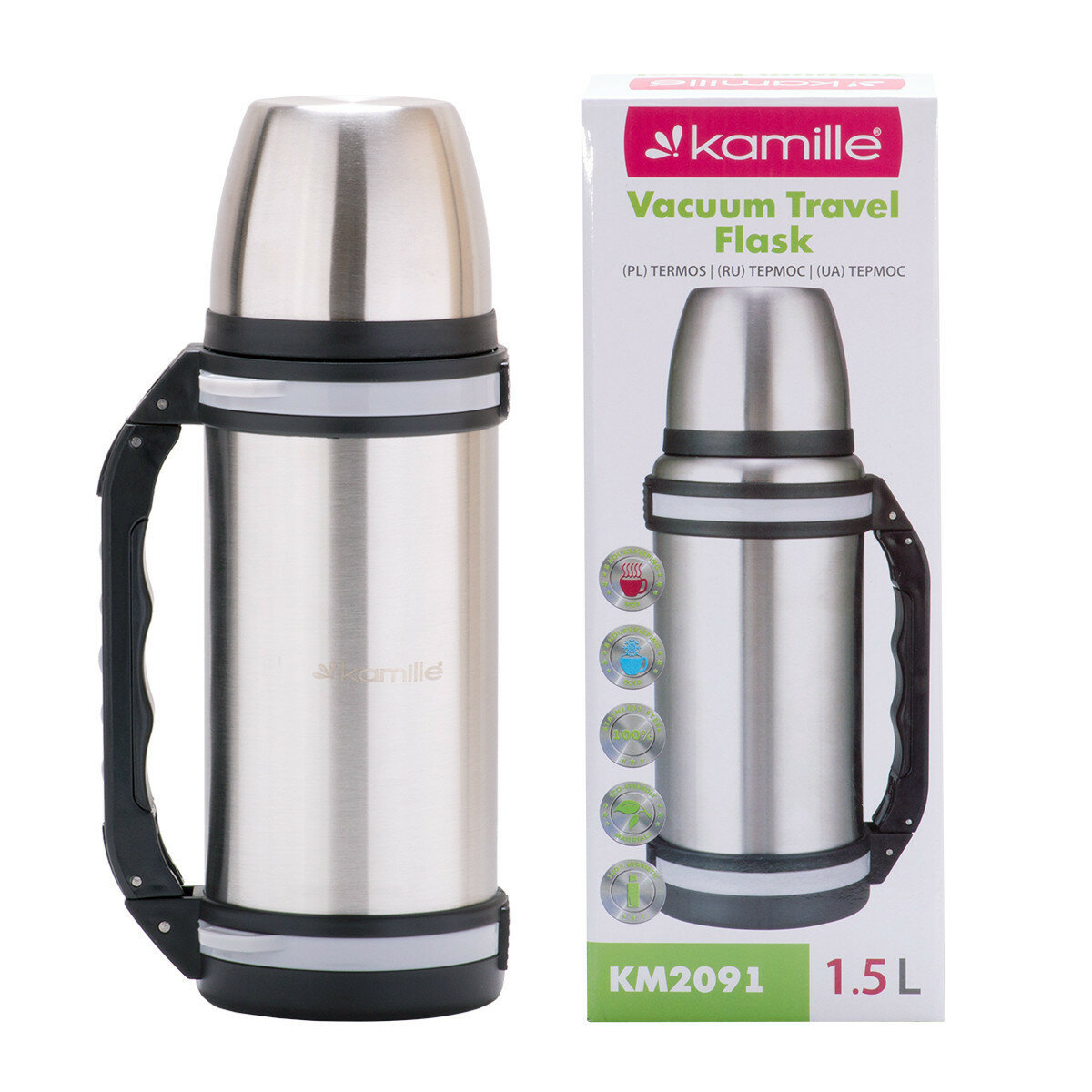 Термос 1,5 л. из нержавеющей стали с ручкой и ремешком Kamille KM-2091 (12)