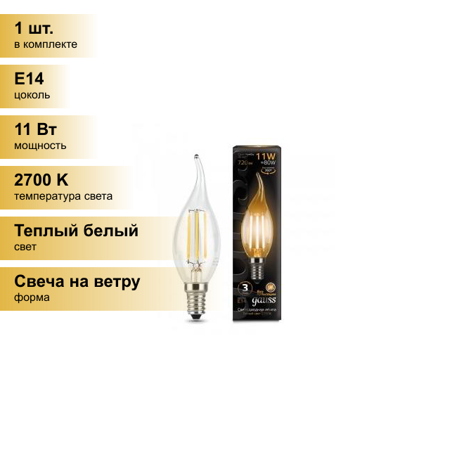 Лампа светодиодная Gauss Filament 11W Е14 Свеча на ветру 2700К 104801111, 1 шт.