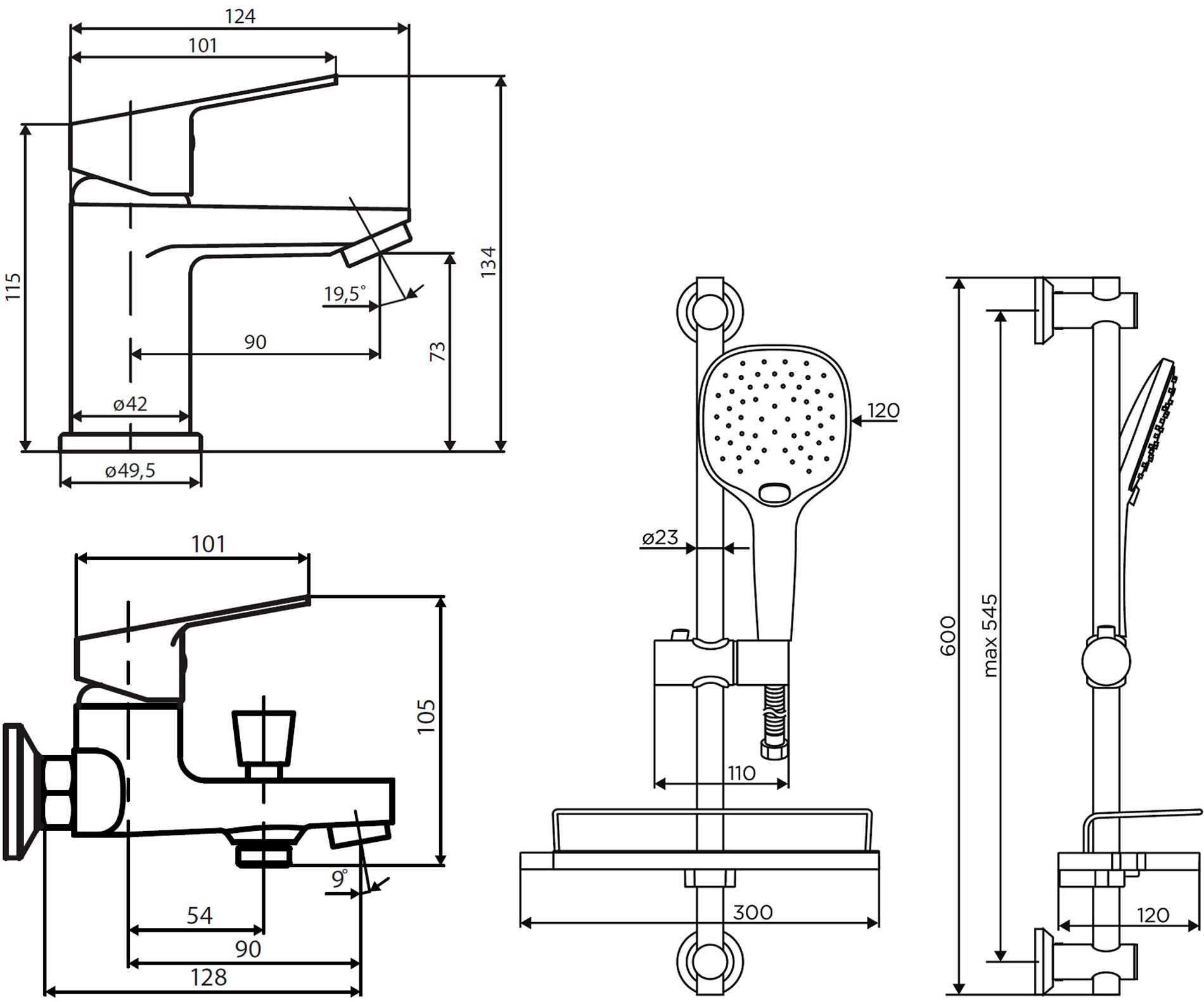 | Комплектация | Смеситель для ванны и душа; Смеситель для раковины;ручной душ;штанга;шланг; полочка;эксцентрики;гибкая подводка;инструкция |