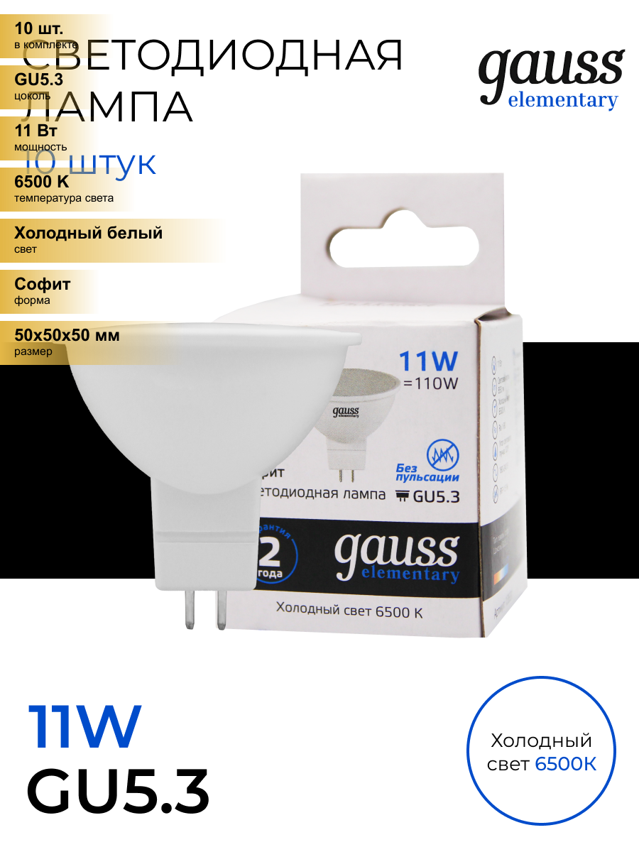 Упаковка светодиодных ламп 10 шт. gauss Elementary 13531, GU5.3, MR16, 11 Вт, 6500 К