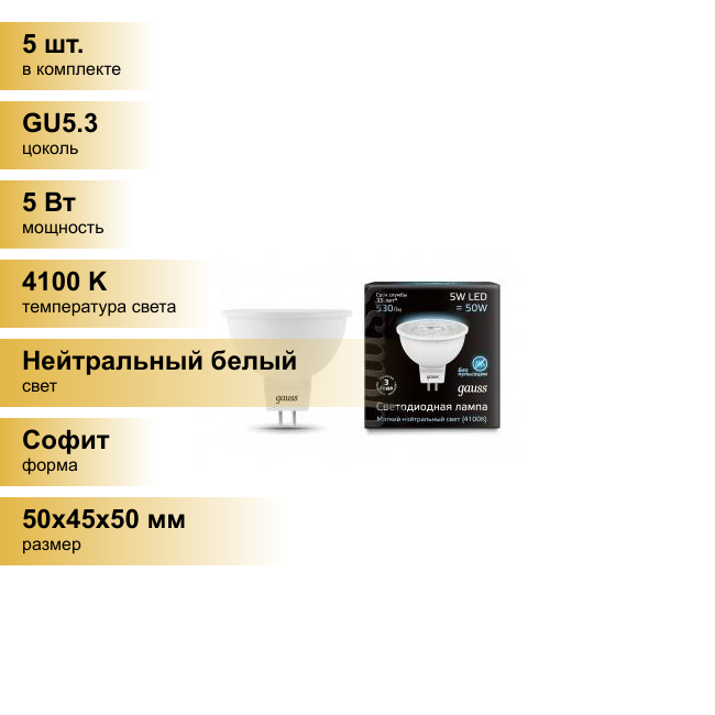 10шт/уп. Лампа LED Спот 5Вт 12B MR16 GU5.3 530Лм 4100К Свет Нейтральный белый арт. 201505205 Gauss, уп. 10шт