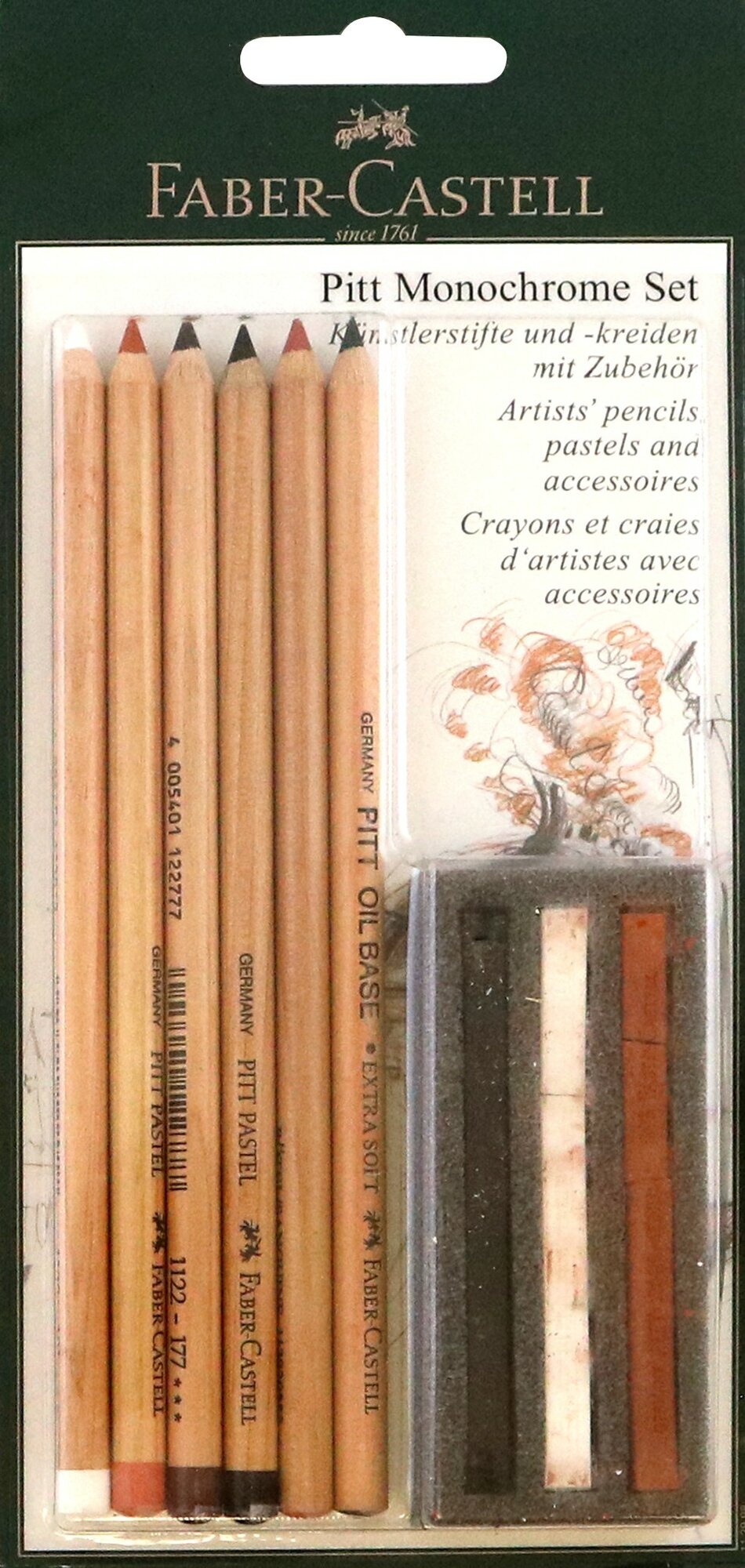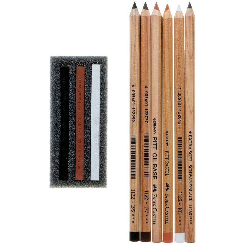 | Подробная комплектация | - 2 масляных карандаша Pitt Oil Base artists`; - 4 Pitt Pastel пастельных карандаша; - 3 Pitt пастельных мелка. |