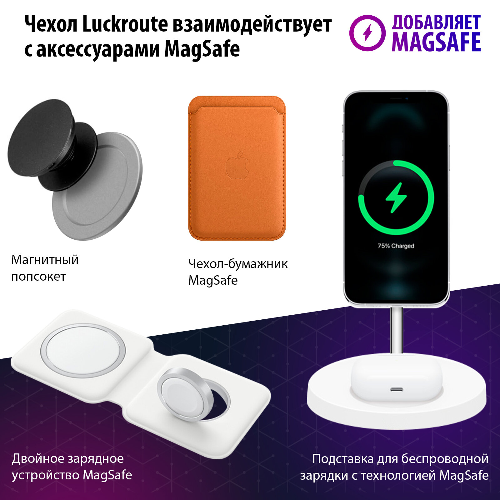 | Особенности | ударопрочный / тонкий / встроенная магнитная пластина / поддержка беспроводной зарядки / MagSafe |