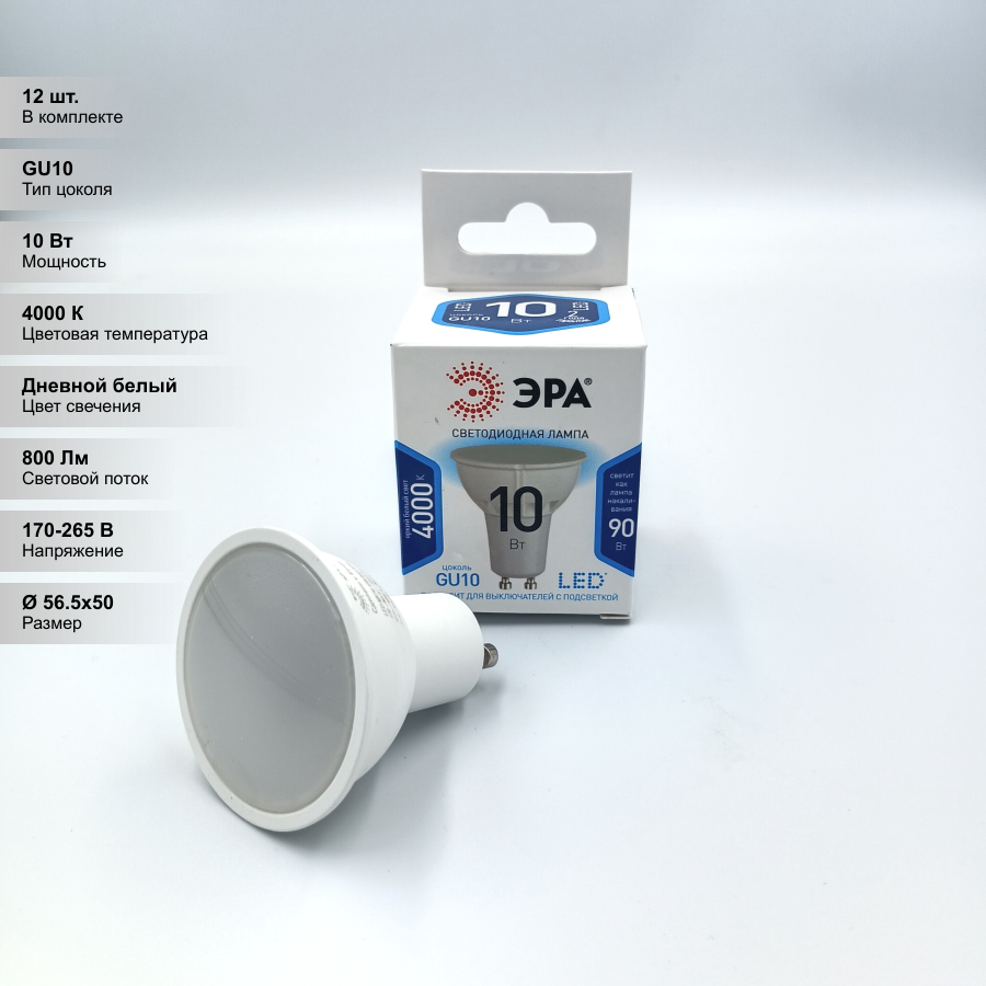 Купить (12 шт.) Светодиодная лампочка ЭРА MR16, мощность 10Вт, напряжение питания 170-265В, цоколь GU10, цветовая температура 4000К, нейтральный белый свет, размер 50х57мм, Б0032998