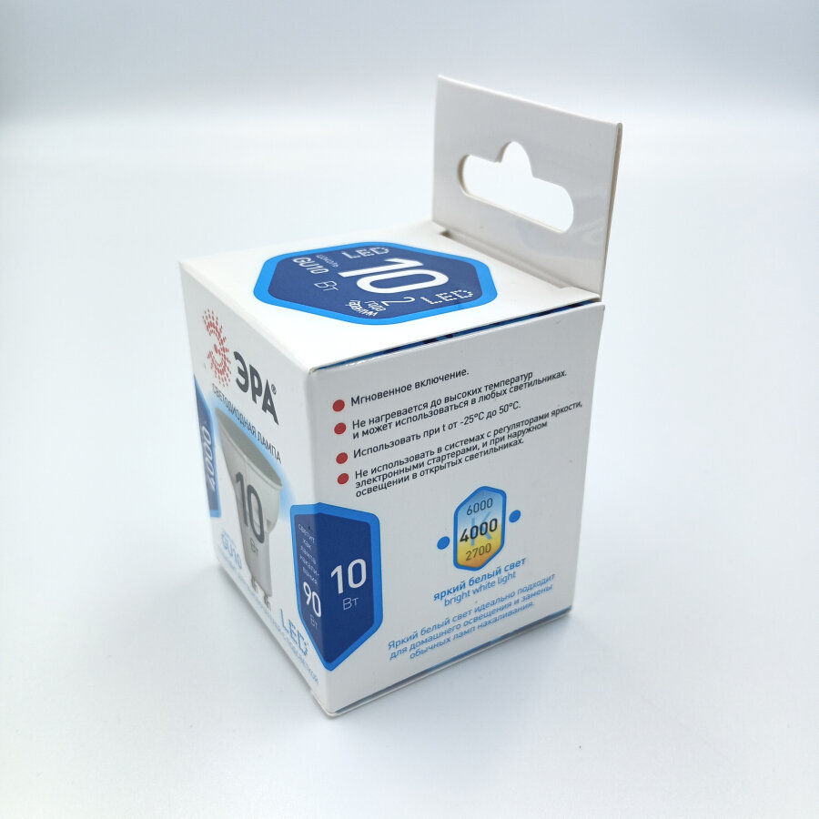 (10 шт.) Светодиодная лампочка ЭРА MR16, мощность 10Вт, напряжение питания 170-265В, цоколь GU10, цветовая температура 4000К, нейтральный белый свет, размер 50х57мм, Б0032998