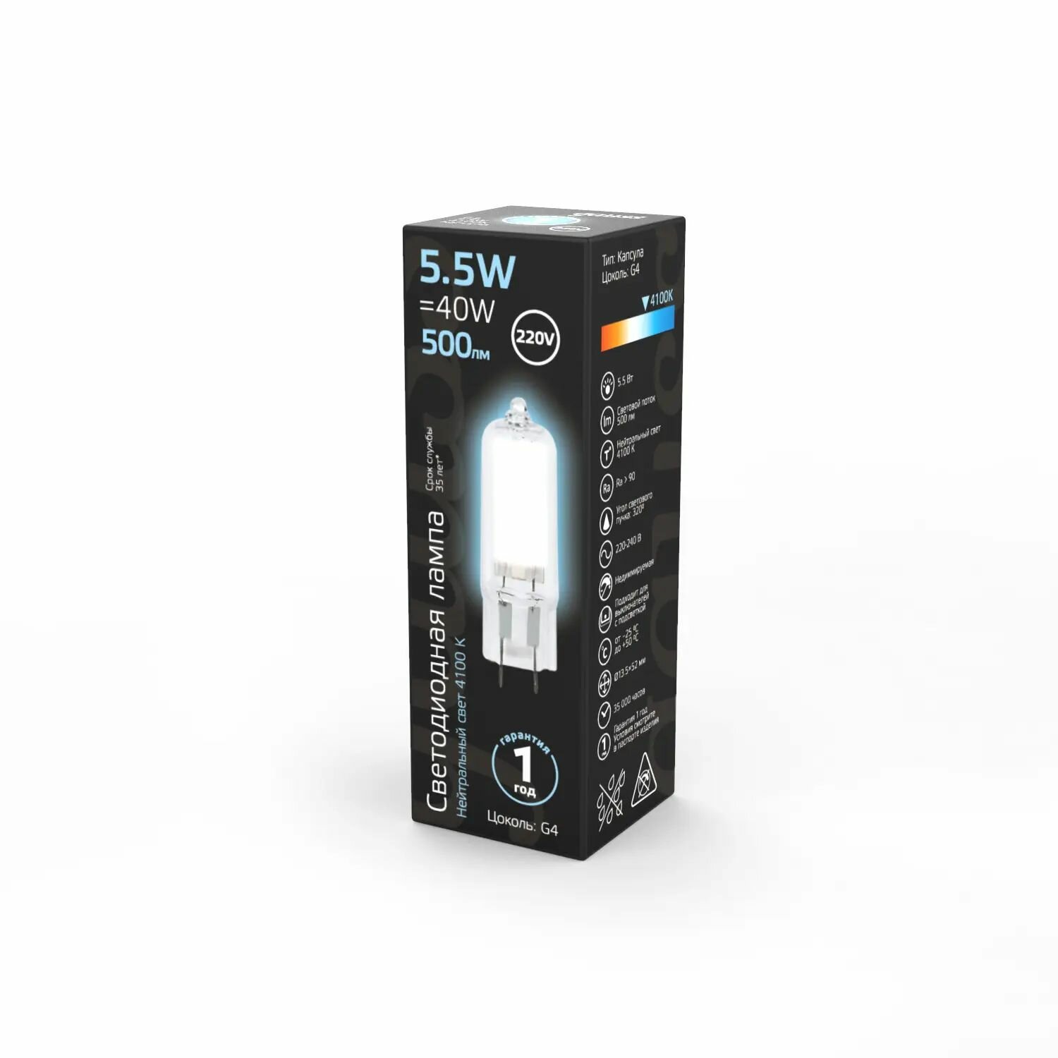 Купить Лампа капсульная светодиодная Gauss Black G4, 5.5 Вт, 500ЛМ, 4100K, AC220-240В, стекло