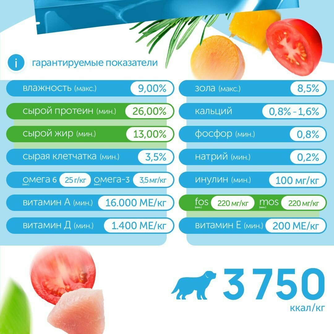 | Состав | Мука из мяса курицы, дробленый рис, пшеничные отруби, куриный жир, масло лосося, семена льна, натуральный усилитель вкуса, обезвоженные фрукты и овощи (манго, яблоко, морковь, томаты), свекольный жом, хлорид натрия, мука из морских водорослей Schizochytrium sp., пребиотики (маннанолигосахариды, фруктоолигосахариды и инулин), экстракт Юкки Шидигера (Yucca schidigera) (0,04%), хондроитина сульфат (0,01%), глюкозамина сульфат (0,03%), витамины (A, D3, E, K3, C, B1, B2, B6, B12, биотин, пантотенат кальция, фолиевая кислота, ниацин, хлорид холина), минералы (железо, медь, кальций, калий, цинк, марганец, селен, натрий), гексаметафосфат натрия, пропионовая кислота, экстракты растений (зеленый чай, розмарин, мята), экстракт токоферола (природный антиоксидант) (0,01%). |