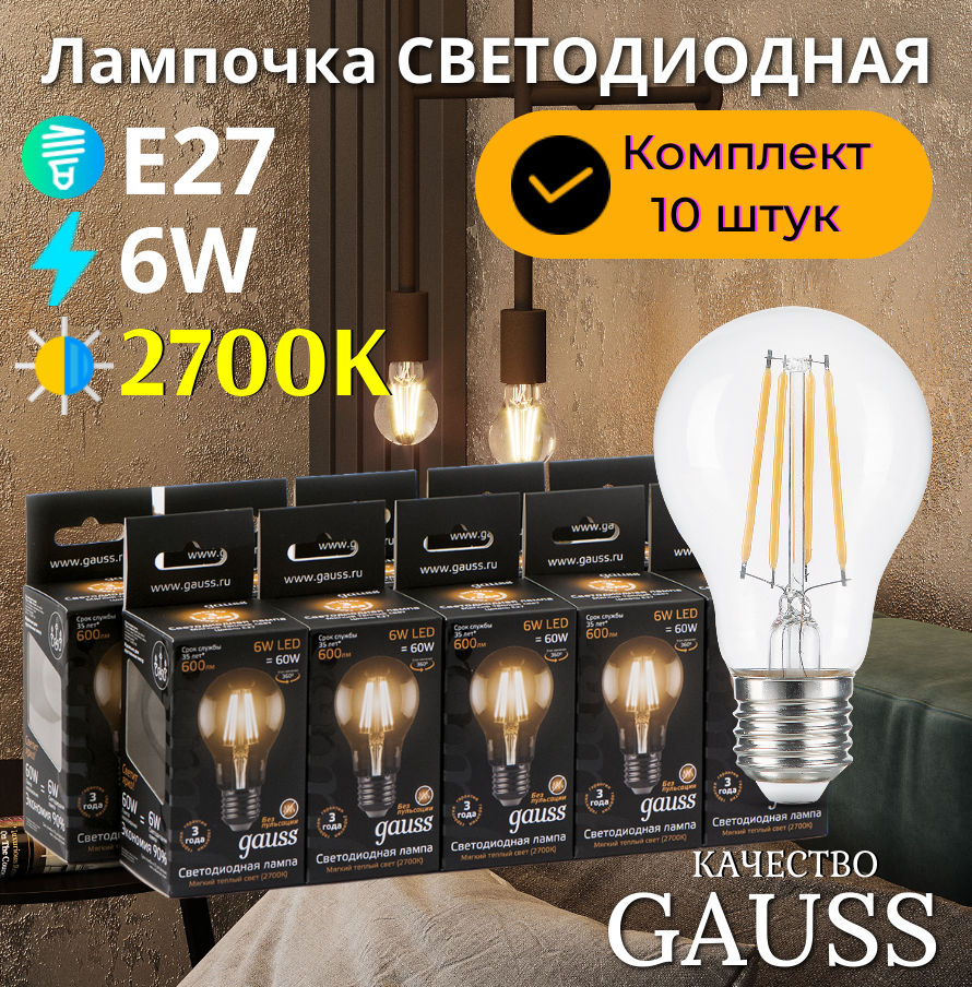 Набор из 10 штук Лампа Gauss Filament А60 6W 600lm 2700К Е27 LED 1/10/40