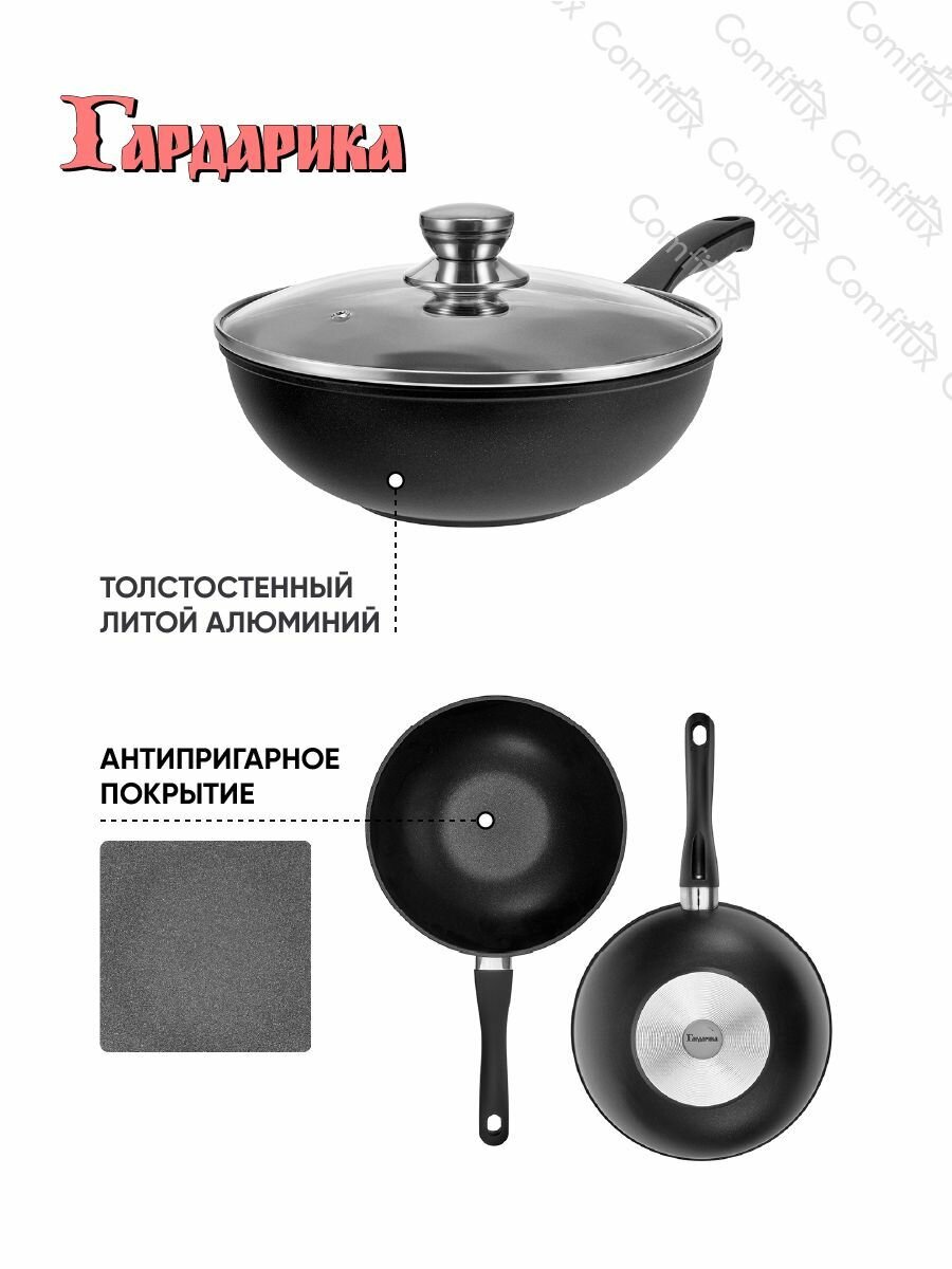 Сковорода вок 28 см с крышкой антипригарная, литая, с ручкой soft-touch, Гардарика Премьера
