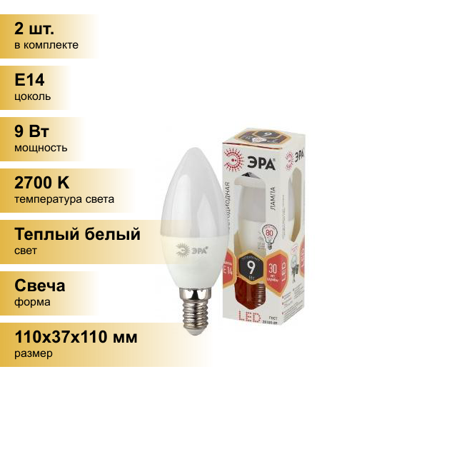(2 шт.) Светодиодная лампочка ЭРА стандарт свеча B35 E14 9W(720lm) 2700K 2K 110x37 B35-9w-827-E14 6689