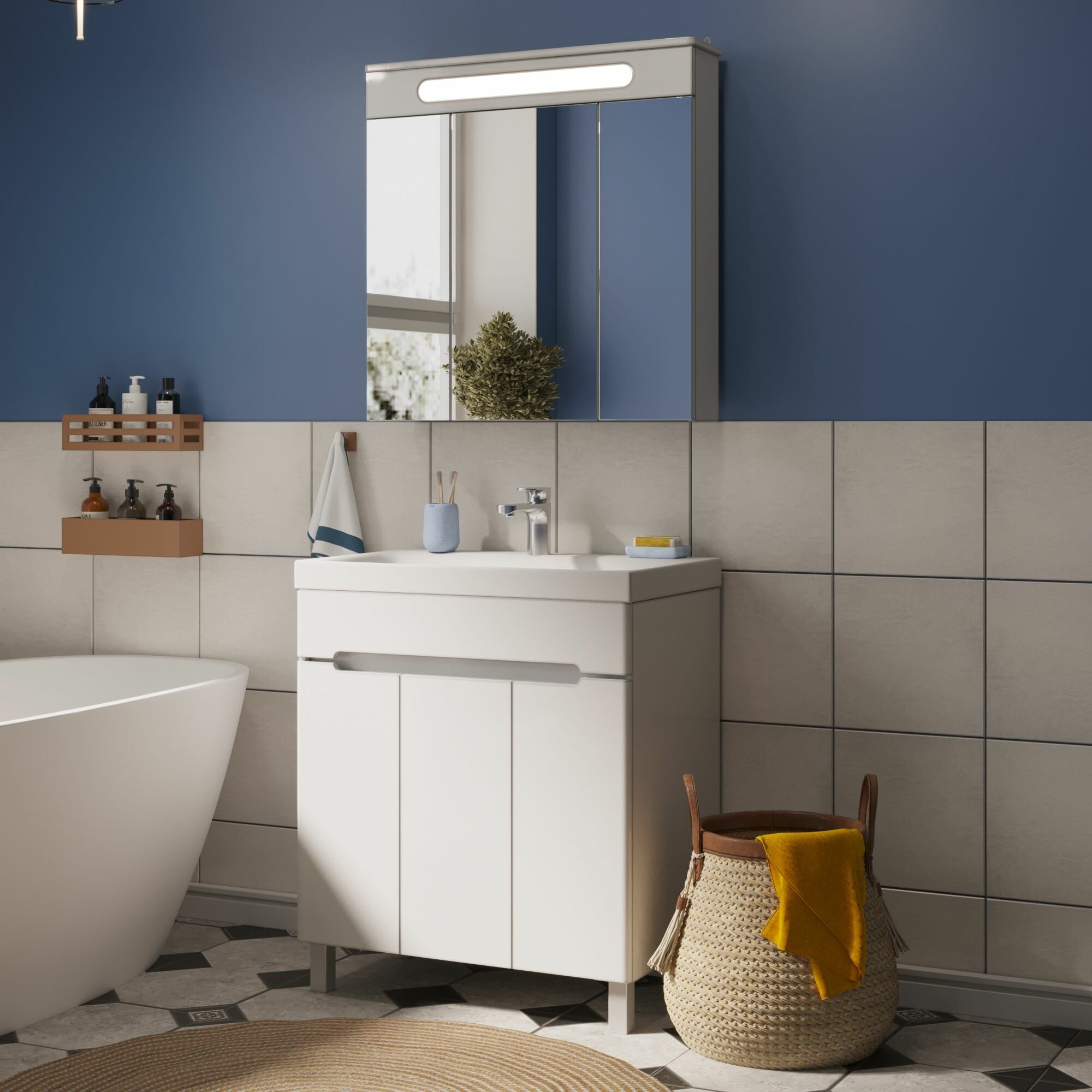 Тумба с раковиной Runo Парма 75, 3 двери, подвесная, раковина Omega 75, выпуск