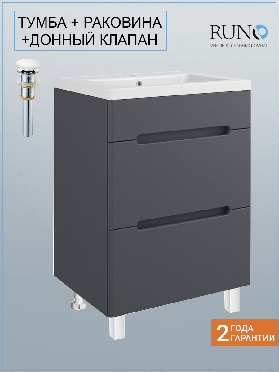 Тумба с раковиной в ванную Runo Парма 60, графит, 2 ящика, напольная, умывальник Omega 60