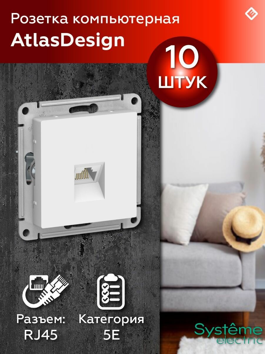 Розетка компьютерная Schneider Electric AtlasDesign 10шт белая RJ45 для компьютера, механизм розетки Шнайдер Электрик Атлас Дизайн ATN000183