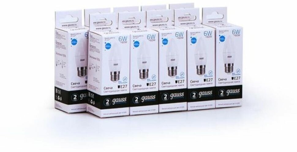 Лампа светодиодная Gauss Elementary 6Вт цок.:E27 свеча 220B 4100K св.свеч.бел.нейт. C37 (упак.:10шт) (33226) интересное:
