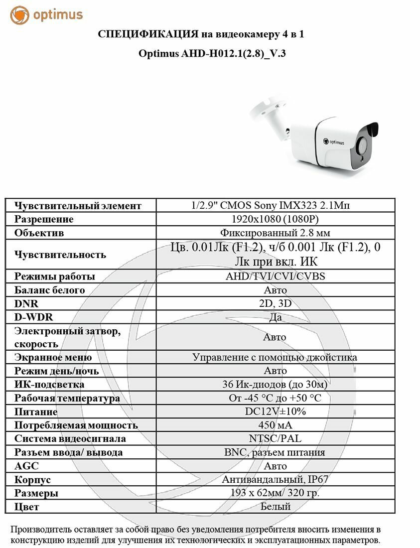 Видеокамера Optimus AHD-H012.1(2.8)E_V.4