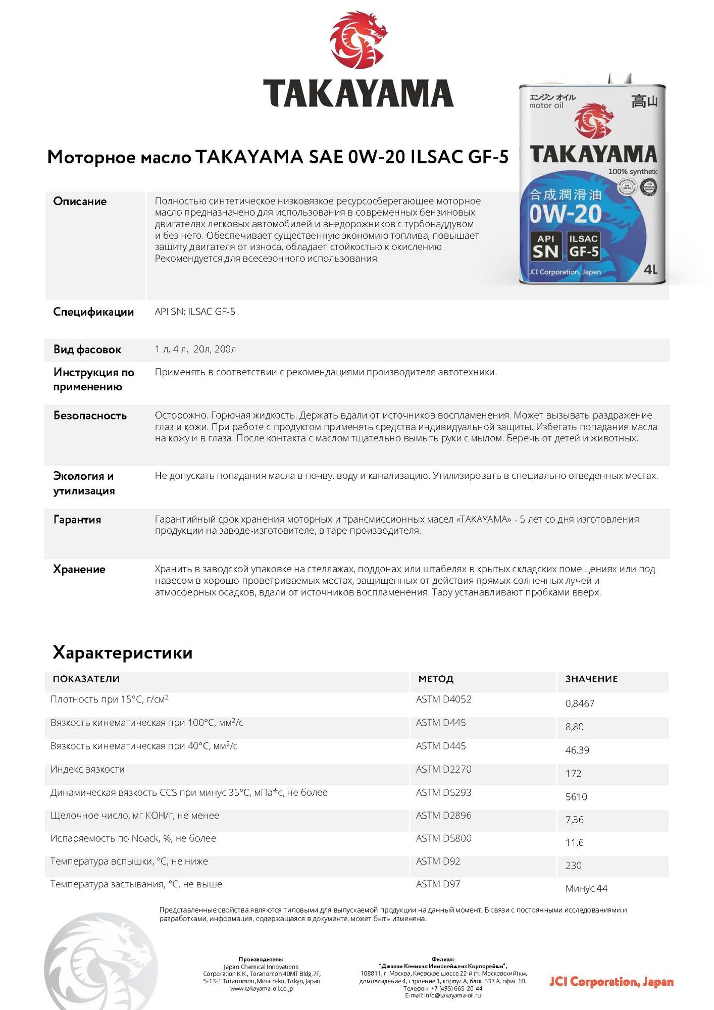 Купить TAKAYAMA 605038 TAKAYAMA SAE 0W-20 ILSAC GF-5, API SN 1